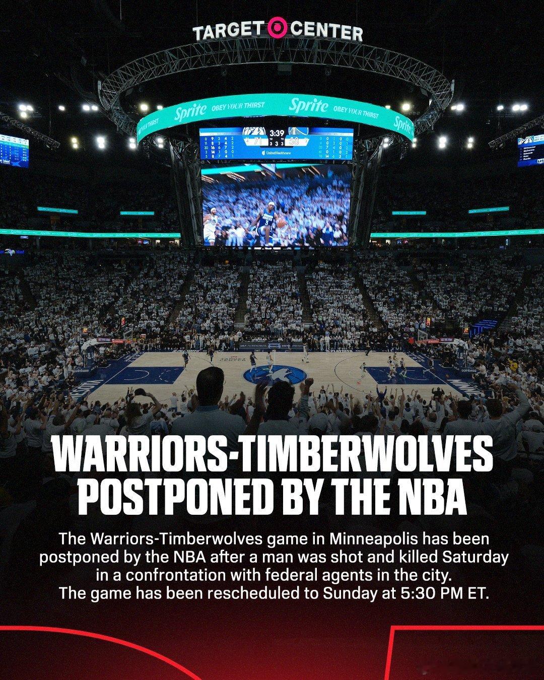 NBA官方宣布,原定今日(北京时间)6点半进行的勇士vs森林狼的比赛,被延期至明日6点半!ESPN表示,明尼阿波利斯市周六发生一起男子与联邦特工对峙时遭枪击身亡的事件,这是该市一周内第2起、本月第3起涉及联邦执法人员的枪击事件。勇士和森林狼的比赛不得不推迟一天进行,两队将在周一和周二连续交手两次。