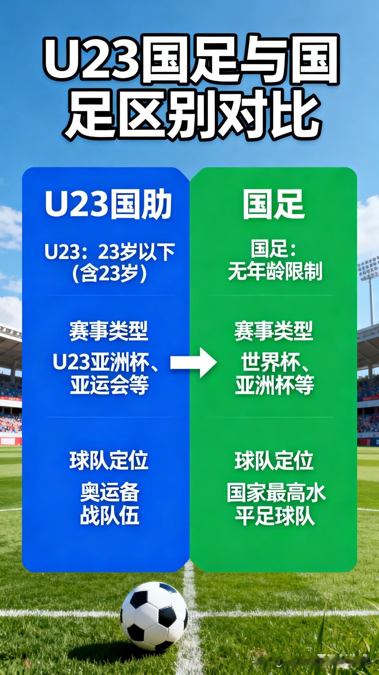 而国足,就是我们常说的国家队,没有年龄限制,挑的是国内最厉害的球员,代表中国足球现在的最高水平,打世界杯、亚洲杯这些大赛。 一句话总结:U23是未来,国足是现在。U23踢出来了,未来的国足才会更强!u23国足和国足有什么区别 U23国足 国足 U23国足已创历史最佳战绩 中国足球 图片由AI生成