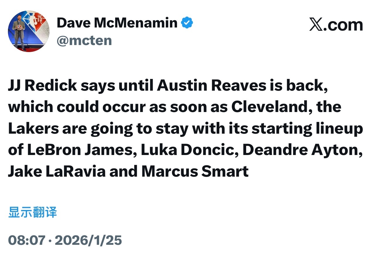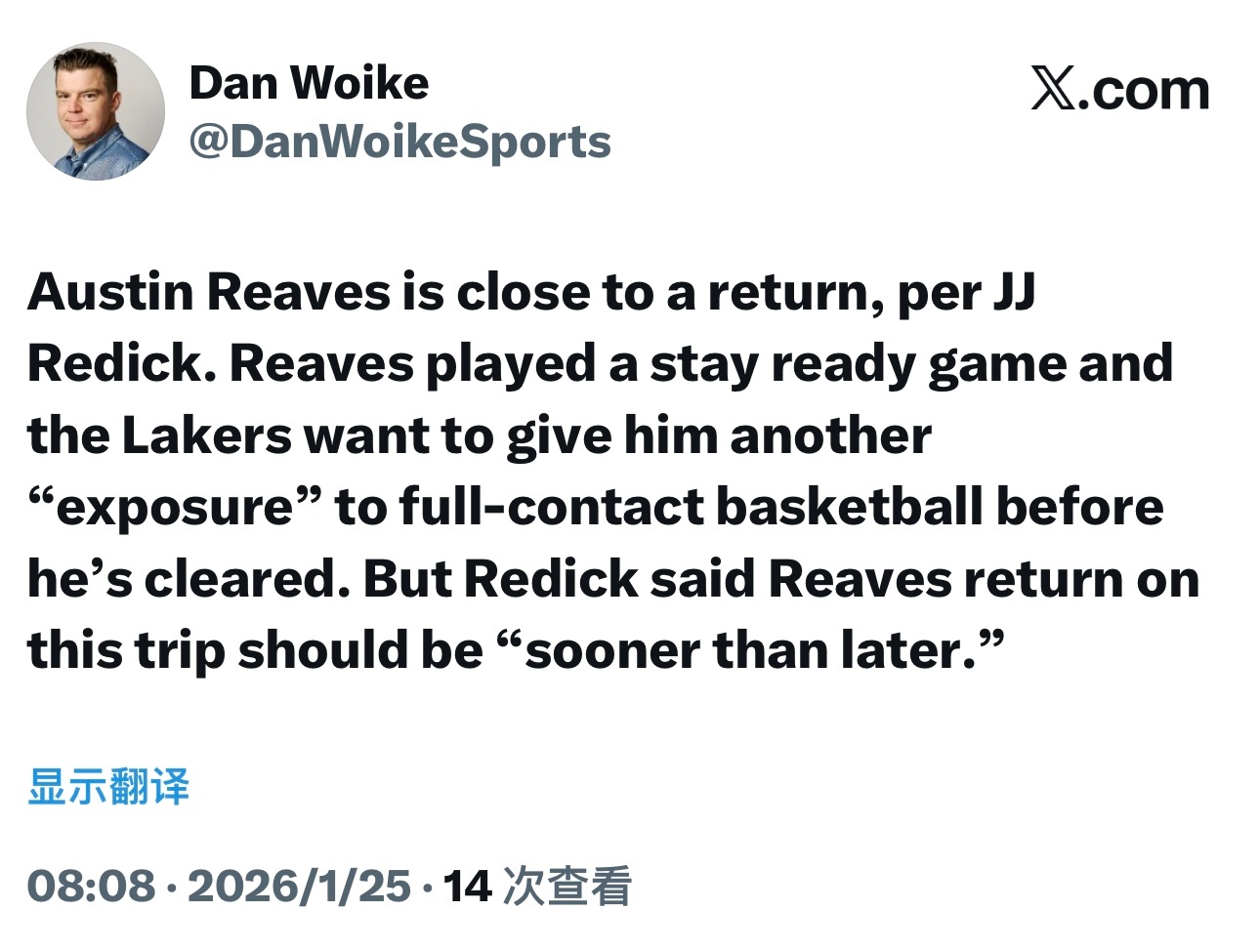 雷迪克表示,在里夫斯回归(最早可能在对阵骑士的比赛中复出)之前,湖人将维持现有的首发阵容(詹姆斯、东契奇、艾顿、拉拉维亚和斯玛特)。里夫斯即将迎来复出,他已经参加了一场保持状态的训练赛,湖人希望在他正式复出前,再让他参加一次全对抗训练来适应强度。雷迪克同时表示,里夫斯会在这次客场之旅中“尽早”回归赛场。