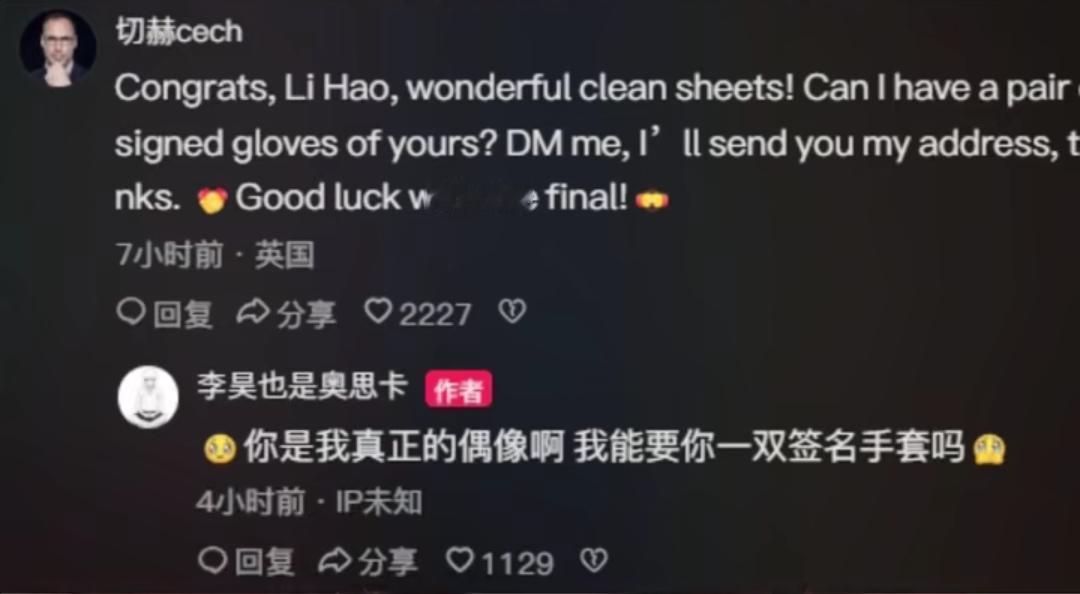 来看看足坛名宿对李昊的夸赞: 切赫公开索要李昊的签名手套,切赫可是李昊的偶像,