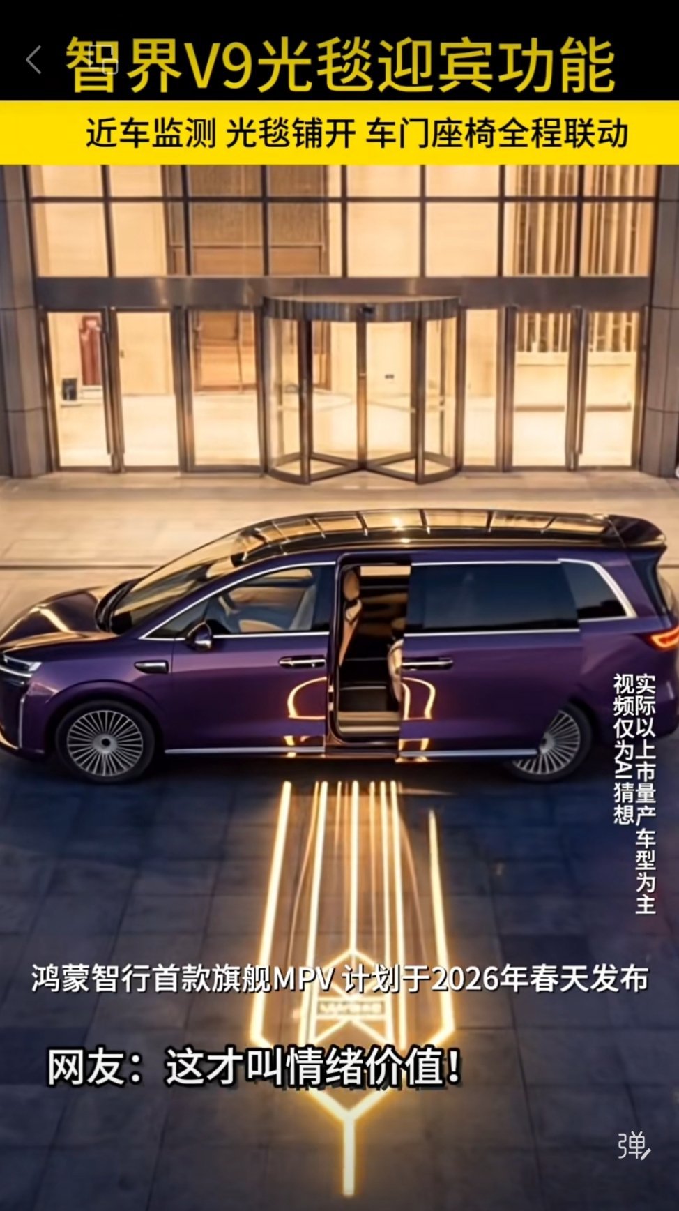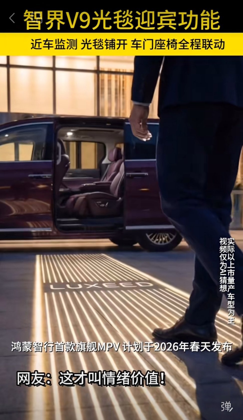 智界V9的光毯功能,居然这么长这么宽的迎宾灯。想象一下,在热热闹闹的酒店会场门口、停车场,突然一道光打在别人车上、脚上,然后车主人信步走来,周围人会是什么样的表情#智界V9#