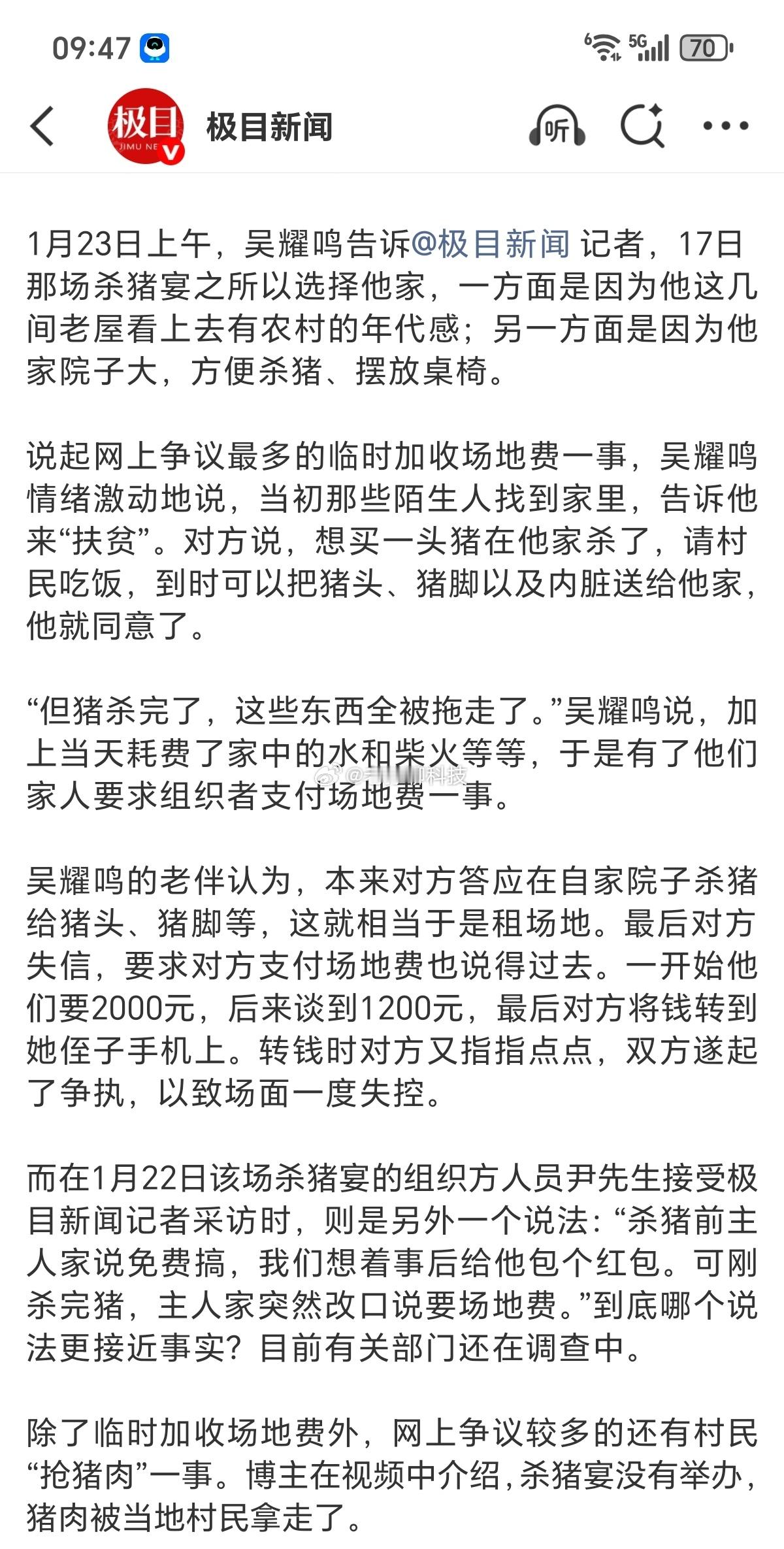 杀猪宴风波索要2000场地费老人发声看到很多评论说穷山恶水出刁民,穷有穷的道理想抢那些自带优越感的城里人,想一想你们可能不了解村民,你们还不了解网红吗只听了网红的一面之词,全都去批评村民,网红的话就这么可信吗能办杀猪宴说明这就是一帮蹭热度的网红,他们有什么道德底线呢