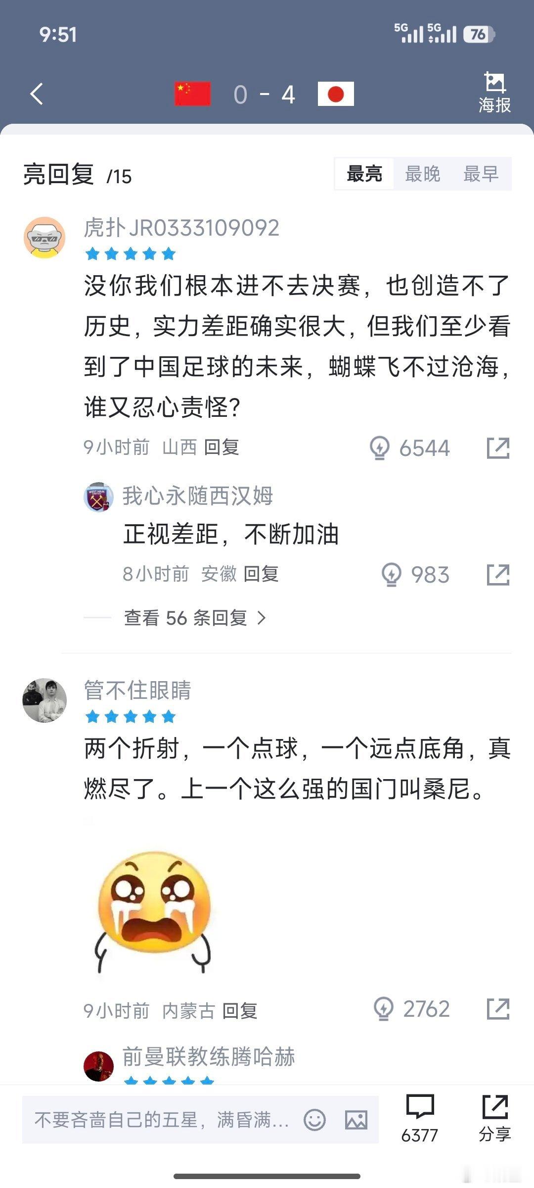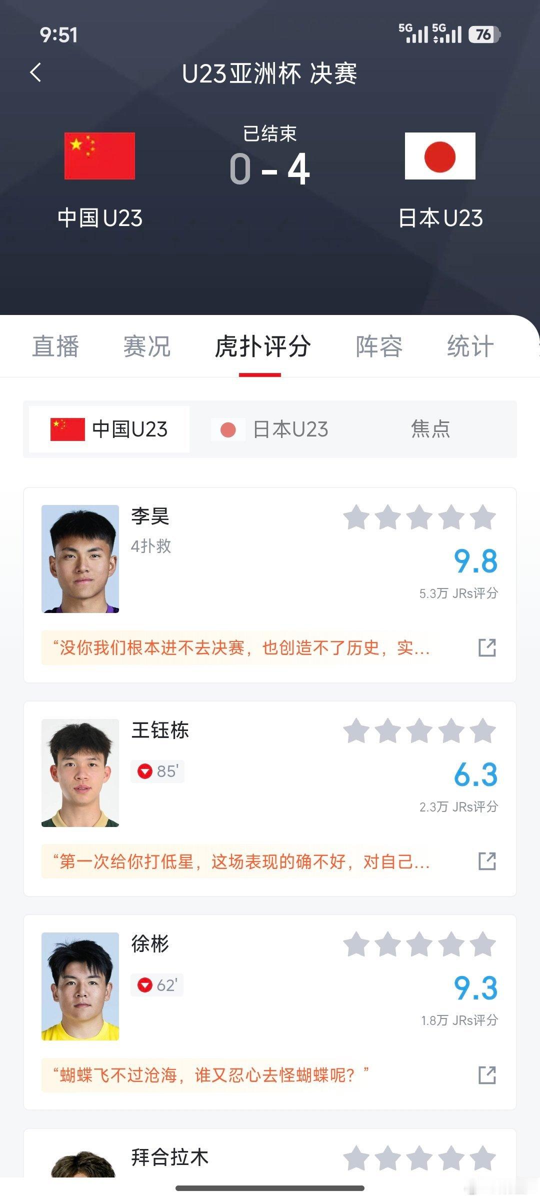 U23国足0比4日本队赛后看了网友们的评分这条评论说的特别好“我们不是输了一场比赛而成为亚军🥈,而是赢下之前所有比赛赢得的亚军”正视差距,不断加油我们已经走在了正确的道路上U23国足球员向球迷致歉U23国足vs日本
