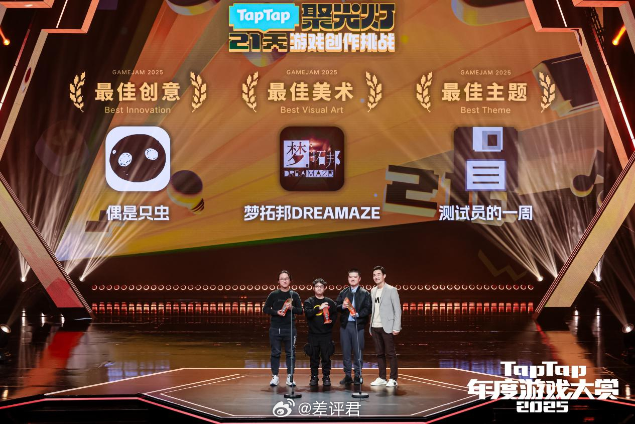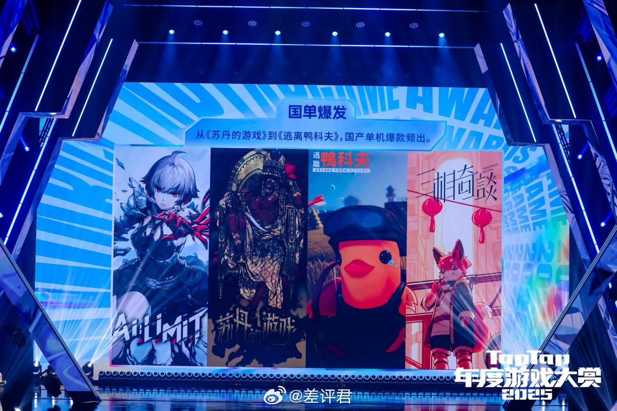 #2025TapTap年度游戏大赏# 正式落幕!今年的年度好游,都在这儿了。今年的TapTap规模不小,随着国内单机游戏市场的发展,以后只会越来越大。今年获奖作品里,既有《无限暖暖》《鬼谷八荒》《逃离鸭科夫》这样在美术风格、玩法深度或题材表达上各具特色的作品;也有《燕云十六声》《崩坏:星穹铁道》这样在多个维度同时获得认可、奖项全面开花的“六边形战士”;同样不乏《异环》《影之刃零》这样尚未正式上线,却已经收获大量关注的潜力之作。奖项评选,是由数百位专业评委(嗯,这里面有我)与数百万张玩家选票共同评选出的结果,构成了大赏的最终答案。而且大赏现场也来了贼多来自国内外的创作者与行业代表,像《光与影:33 号远征队》创意总监 纪尧姆·布罗什,库洛游戏 CEO、制作人 李松伦,《去月球》制作人 高瞰 等多位重量级嘉宾,都共同见证了这个精彩一夜。Epic Games 副总裁、虚幻引擎总经理 Bill Clifford也作为颁奖嘉宾出席大赏,一个坚持 0 分成,一个长期推动更开放的分发生态,终于 TapTap 与 Epic Games 今年坐到了同一张桌前,共同探讨更开放、多元的游戏分发方向。带来新消息的,则是《潜水员戴夫》的制作人 黄载皓,正式公布了《潜水员戴夫》国服上线时间为2月6日。明年大作云集,也是火药味十足,2026 年,让我们一起期待更多好游戏的到来吧。#燕云十六声获年度最佳游戏