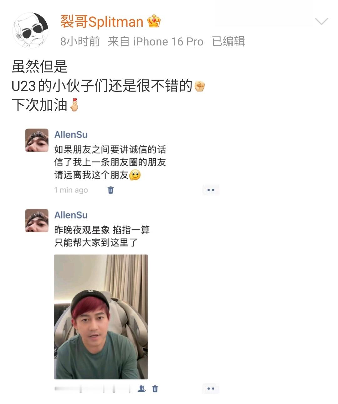【苏醒说 U23 的小伙子们很不错】看得出苏醒真的热血了哈哈! U23国足0比4日本队最终获得亚军,苏醒赛前发博“谁还没个热血的时候了”希望中国队夺冠,尽管没能实现愿望,但赛后他也认为“U23的小伙子们还是很不错的,下次加油。”