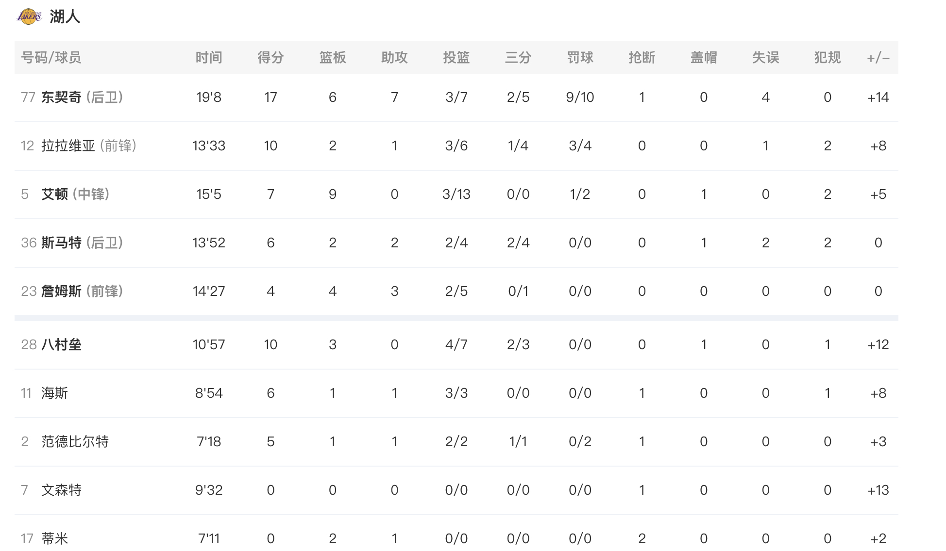 半场结束,湖人65-52独行侠,如何评价半场表现?湖人vs独行侠 詹姆斯4分4篮板3助攻,东契奇17分6篮板7助攻,艾顿7分9篮板,拉拉维亚10分2篮板1助攻,斯玛特6分2篮板2助攻,八村10分3篮板,海斯6分1篮板1助攻,范德彪5分1篮板1助攻,蒂米2篮板1助攻2抢断。