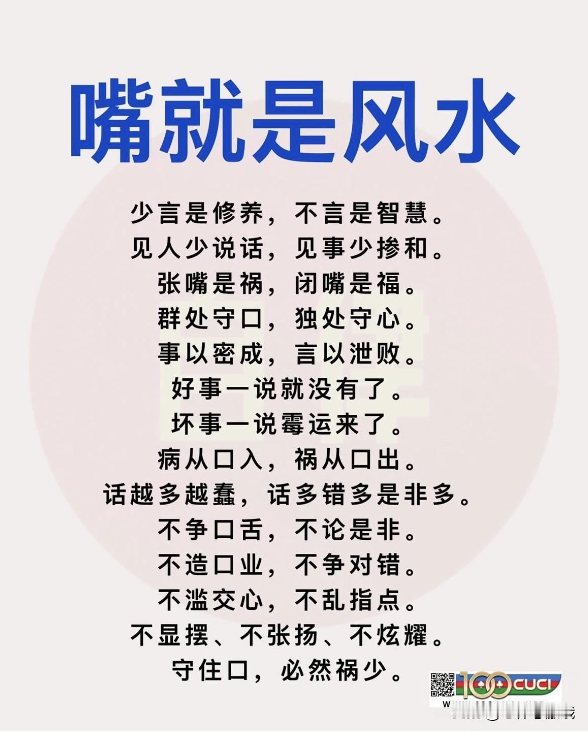 少言是修养,不言是智慧。 见人少说话,见事少掺和。 张嘴是祸,闭嘴是福。 群处守口,独处守心。 事以密成,言以泄败。 好事一说就没有了。 坏事一说霉运来了。 病从口入,祸从口出。 话越多越蠢,话多错多是非多。 不争口舌,不论是非。 不造口业,不争对错。 不滥交心,不乱指点。 不显摆、不张扬、不炫耀。 守住口,必然祸少。 少言的修养 三句话最好不说 少言的智慧 闭嘴是种修养 都少说两句 不要说这六种话 沉默是金的智慧 少说三 种话