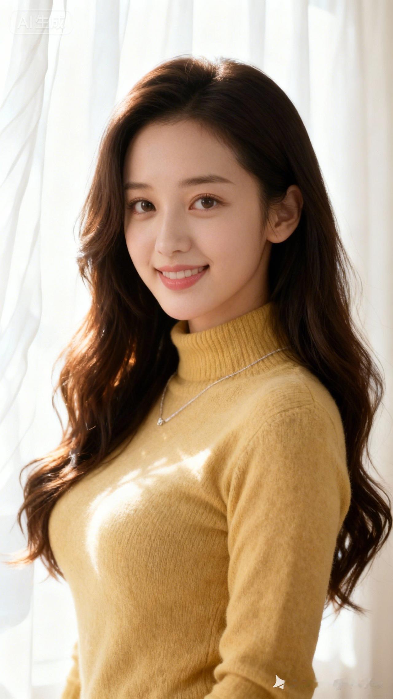 温暖阳光下的甜美微笑,黄色毛衣搭配自然妆容,清新动人!🌞💛😊