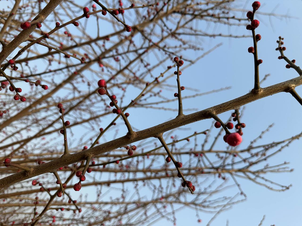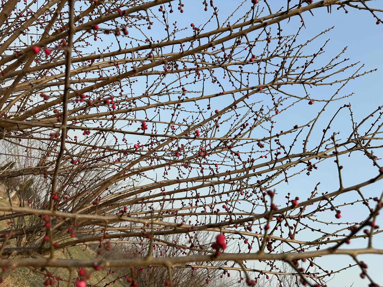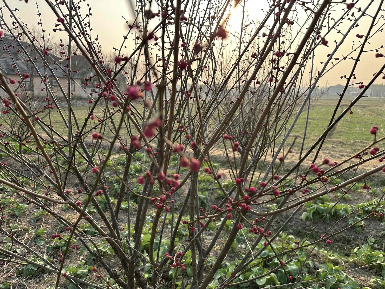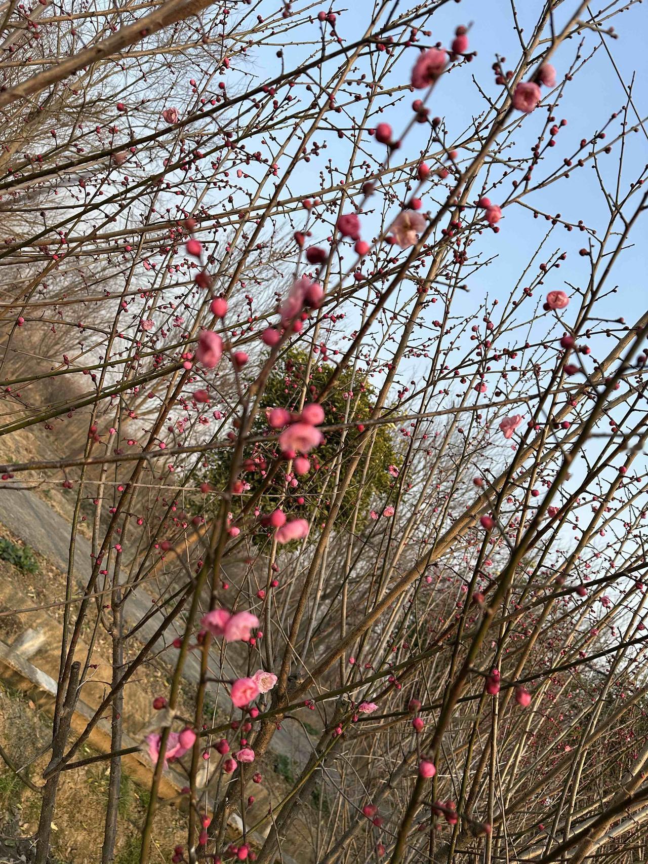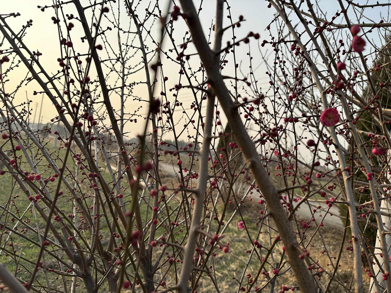 老爸种的红梅,在四九天里开了! 坐标:老家田野边 节气:四九寒天 推开家门,一眼就看见老爸种的这片梅园。 枝条上密密麻麻的花苞,像无数个小红豆爬满枝头,有的已经悄悄绽开粉嫩的花瓣,在料峭寒风里倔强地舒展着。 都说“梅花香自苦寒来”,今天算是亲眼见识了。 零下几度的天气,别的植物还在沉睡,只有这些红梅,迎着冷风把花苞憋得通红,非要在最冷的时节里,给田野添上第一抹亮色。 老爸总说:“梅花这东西,越冷越精神。” 现在看着满枝的花苞,突然懂了他的意思。就像他一辈子扎根农村,不管日子多难,都能活出一股韧劲儿。 这大概就是年味最鲜活的样子吧,不是商场里的热闹,而是家门口这一片迎寒绽放的红梅,和藏在花苞里的春天。🌺