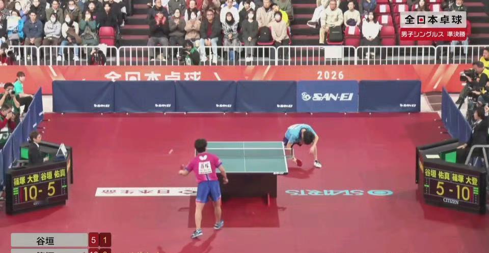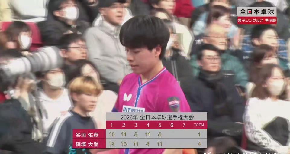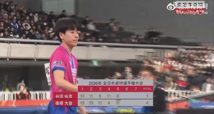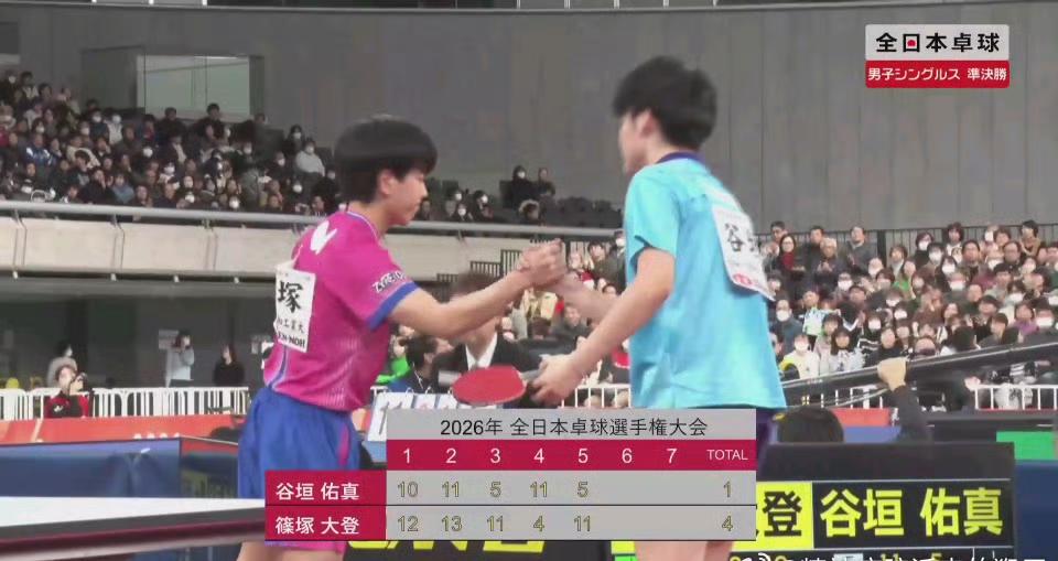 篠塚大登晋级决赛[吃瓜群众], 刚刚,筱塚大登4-1击败日本队和他一样同是2003年出生的谷垣佑真,晋级2026年全日锦男单决赛,五局具体比分为:篠塚大登12-10,13-11,11-5,4-11,11-5。 篠塚大登这是连续两年晋级男单决赛了,隔壁球台松岛辉空也3-2领先了,松岛如果能淘汰张本智和,那决赛就是大登和松岛一试身手了[吃瓜群众]。