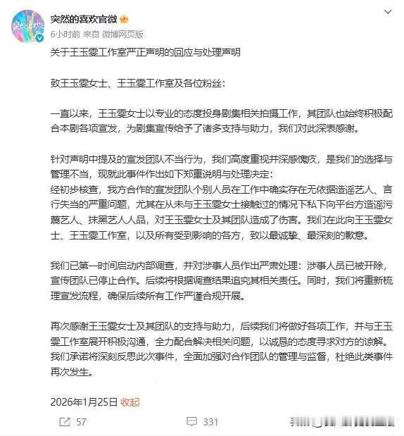 王玉雯声明停止宣发,剧组马上道歉并开除有关人员 由王玉雯、陈星旭主演的电视连续剧《突然的喜欢》刚刚上线,正在热播,却传来了女主演王玉雯的严正声明。 大概意思就是剧组在宣发过程当中出现了很多不专业,不严谨的地方,而且涉嫌制造谣言挑拨离间,所以一怒之下停止宣发。 剧方反应非常迅速,立马发了声明回应,说已经开除相关人员,调整工作流程,保证严谨合规,同时恳请王玉雯原谅。 这一次真的要为王玉雯点赞。曾经有很多影视作品,为了作品上线的热度,故意炒作很多话题,但是为了顾全大局,有些演员明明不赞同,但也只能忍气吞声,毕竟行业规则也不是一个人、两个人可以打破的。 现在她勇敢的站出来,剧方也认识到了问题的存在,拨乱反正是一个双赢的结局。这部剧我正在看,还不错,俊男靓女的组合,轻松幽默的风格,非常减压治愈,推荐。