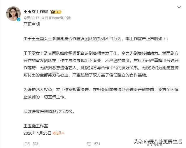 王玉雯声明停止宣发,剧组马上道歉并开除有关人员 由王玉雯、陈星旭主演的电视连续