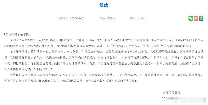 国家体育总局中国足协致贺信北京时间25日凌晨,2026年亚足联U23男足亚洲杯在沙特阿拉伯吉达收官。决赛中,中国队0:4不敌日本队,最终获得亚军。国家体育总局、中国足球协会分别致贺信。