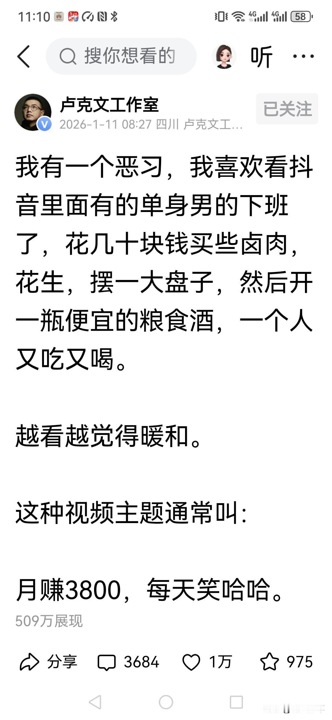 这样的心理是不是大家都有,喜欢在网上看着别人过的很一般,或者过的比自己差! 总是喜欢一边看视频一边和自己比较。 有时候是觉得这样一个人自酌自饮是自己向往的自由生活! 有时候觉得这样一个人的生活比较惨,不如自己老婆孩子热炕头! 有时候又觉得看看视频就觉得原来世界上还有这么多比自己更惨的人,瞬间心理就平衡了! 大家都喜欢在网上看什么视频呢?都是为了看啥?