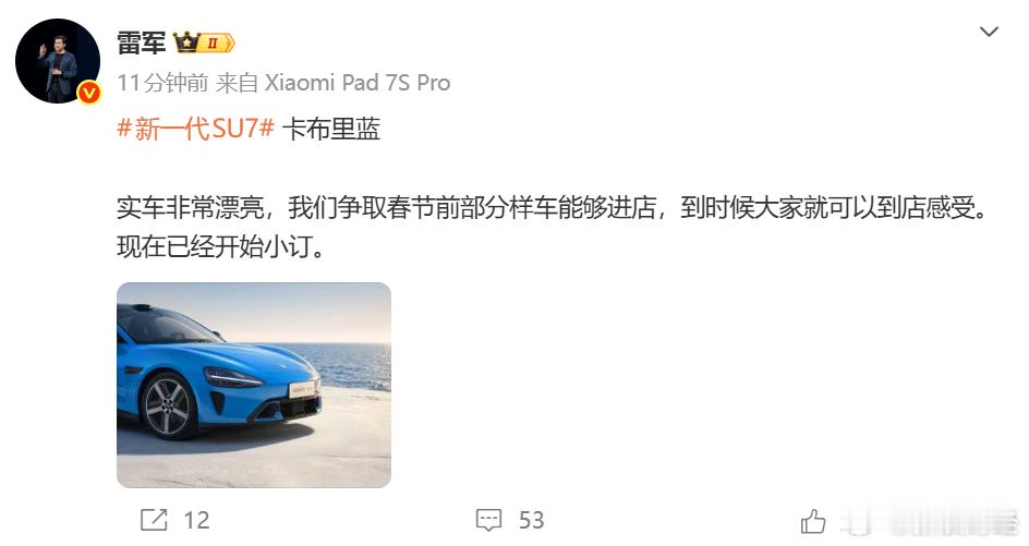 【雷军称新一代SU7争取春节前样车进店】雷军回顾小米造车初心1月25日,小米创办人、董事长兼CEO发文表示,新一代SU7卡布里蓝实车非常漂亮,争取春节前部分样车能够进店,到时候大家就可以到店感受。现在已经开始小订。