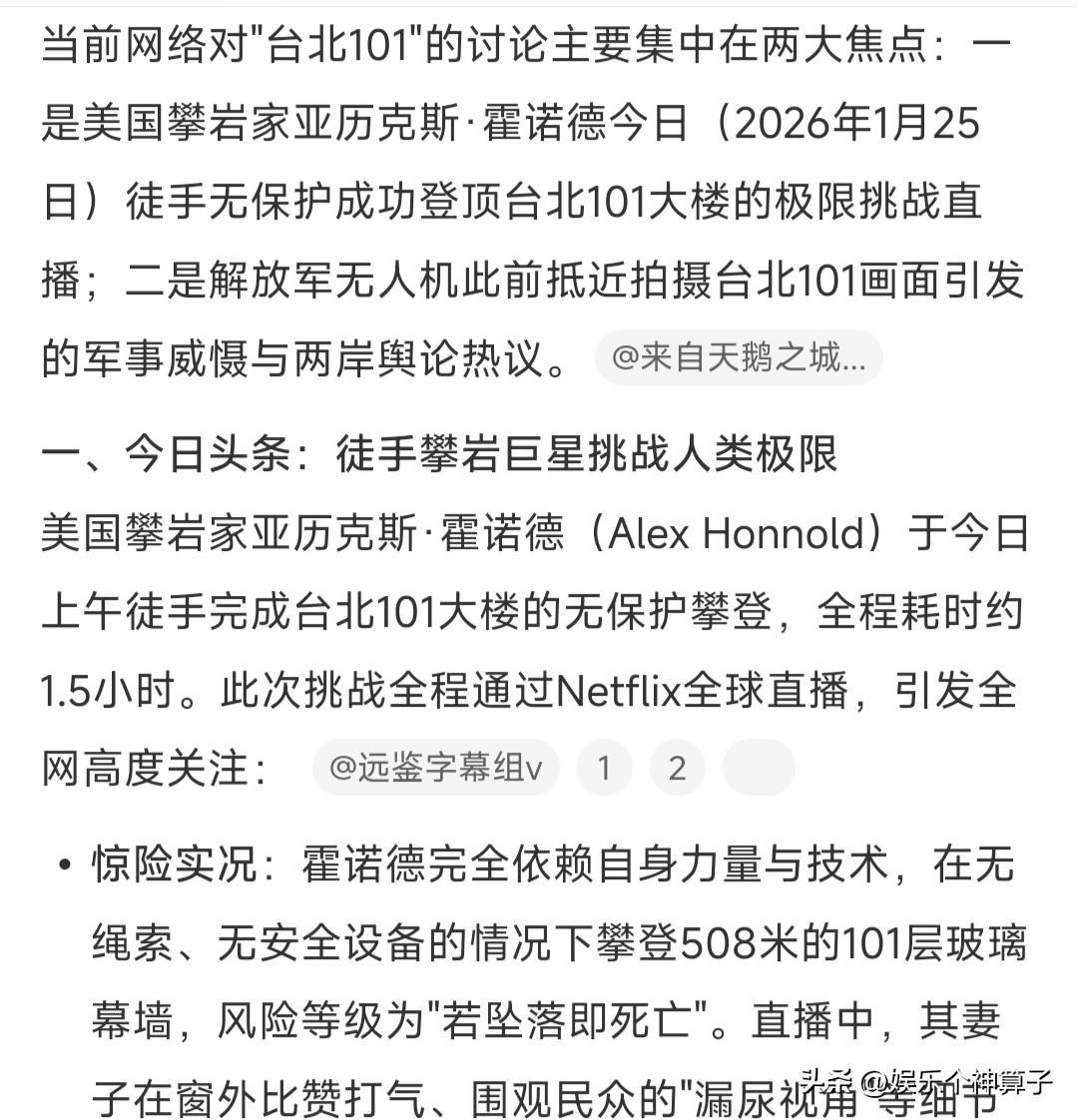 太强了!Alex Honnold徒手爬上台北101大楼,仅用了一个半小时…… 1月25日,在网上看到消息,Alex Honnold(艾利克斯·霍诺德)徒手攀爬到台北101大楼的顶部,引发网友热议。 看到视频,不得不说,这位攀岩家真的太强了,没有借助任何工具,安全绳都没有,心理素质好稳,509米高的大楼,一个多小时登顶,还在上面开心自拍…… 妻子在对面的楼里,给老公Alex Honnold加油,登顶那一刻,电视机前的观众开始热情的鼓掌。 说实话,对于恐高的人,看到视频,有点瑟瑟发抖,手心里都捏了一把汗,真的是用生命在挑战。 有点好奇,爬这么高,该怎么下来,站在顶端,视野宽阔,应该有种一览众山小的感觉吧!