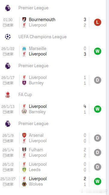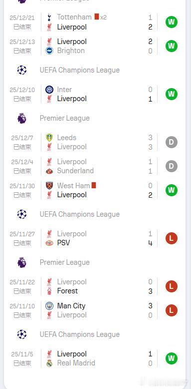 自利物浦与埃弗顿的德比战以来,他们在英超联赛中只赢了5场比赛。• 利物浦 2-1 埃弗顿 — 2025年9月20日自去年九月以来只赢了5场!!!分别是2-1 埃弗顿2-1热刺 2-0 布莱顿 2-0西汉姆 2-1 狼队