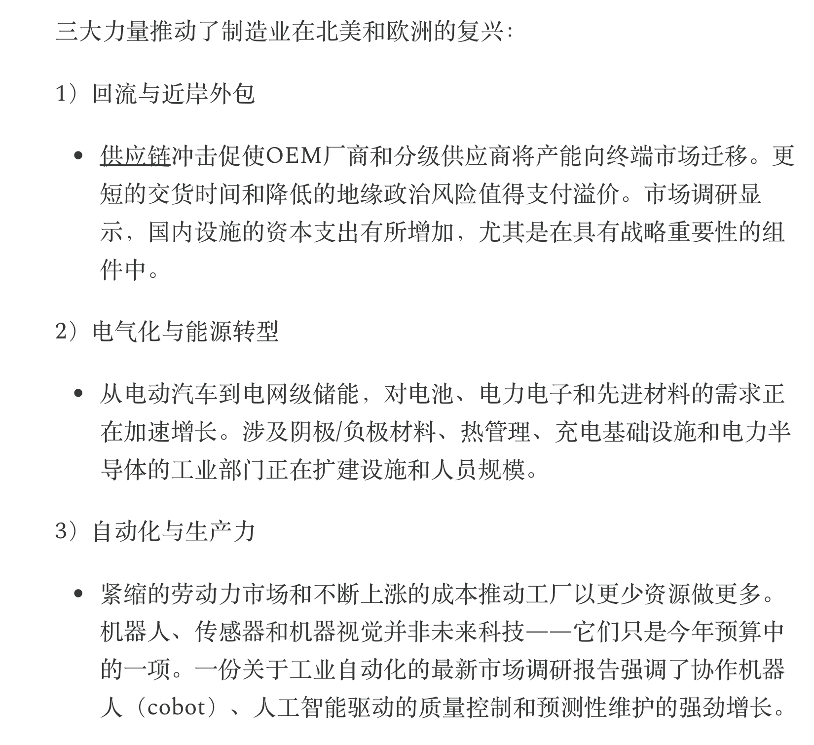 三大力量推动了制造业在北美和欧洲的复兴:半导体与先进电子学、电池制造与电动汽车供应链、工业自动化与机器人等七大行业进入“活力涌现”。