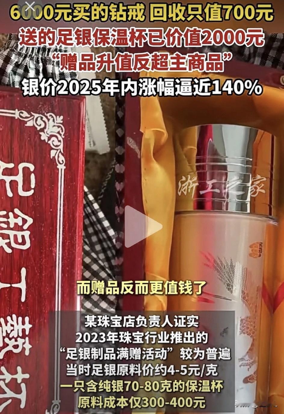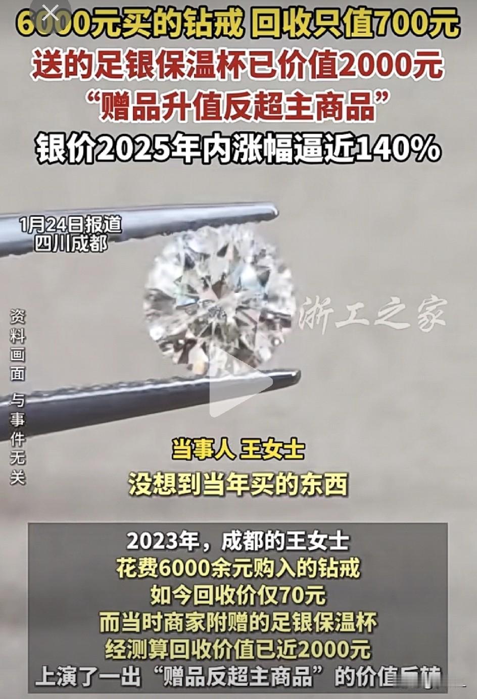 买钻戒三年后价值翻车,而当年免费“赠品”银杯子如今身价反超钻戒!网友:当真是风水轮流转! 三年前买钻戒送的“赠品”银杯子,现在居然比钻戒还值钱!你敢信? 2023年,成都的王女士花6000多块买了枚钻戒,店家送了个标注“足银999”的保温杯。 当时银价便宜,这杯子成本也就三四百元。没想到,三年后银价暴涨,从4块多一克飙到22块多一克! 王女士一算账:杯子里的纯银内胆现在能卖快2000块,可那枚钻戒回收价只剩700块……亏麻了! 钻戒:“说好的一生一世呢?” 银杯子:“不好意思,我才是潜力股✨” 这几年银价疯涨,国际白银价格三年涨了近140%,比黄金猛得多!为啥?光伏、AI、电动车这些高科技行业都在抢白银,供应还跟不上,价格嗖嗖往上飙。 现在不少珠宝行业的人都回忆起来:“前几年搞活动,足银杯子、银碗当赠品可太常见了!” 好多网友翻箱倒柜:“我家好像也有!”、“是不是该拿去验验货了?” 不过也有人怀疑:这杯子真全是银的吗?别是镀的吧? 不过,也有网友很理智,“买喜欢的东西从来不是为了保值,如果要保值应该一开始就买黄金!” 王女士倒很淡定:先不卖,再观望观望,万一银价继续涨呢~ 所以……你家有那种“不起眼”的赠品吗?快找找,说不定里面藏着“白银宝藏”呢! 这可真是风水轮流转啊,白银这股后起之秀强势崛起、锐不可当。所以,先别扔“便宜赠品”,说不定哪天它就逆袭了! 素材来源:浙工之家,侵联删!