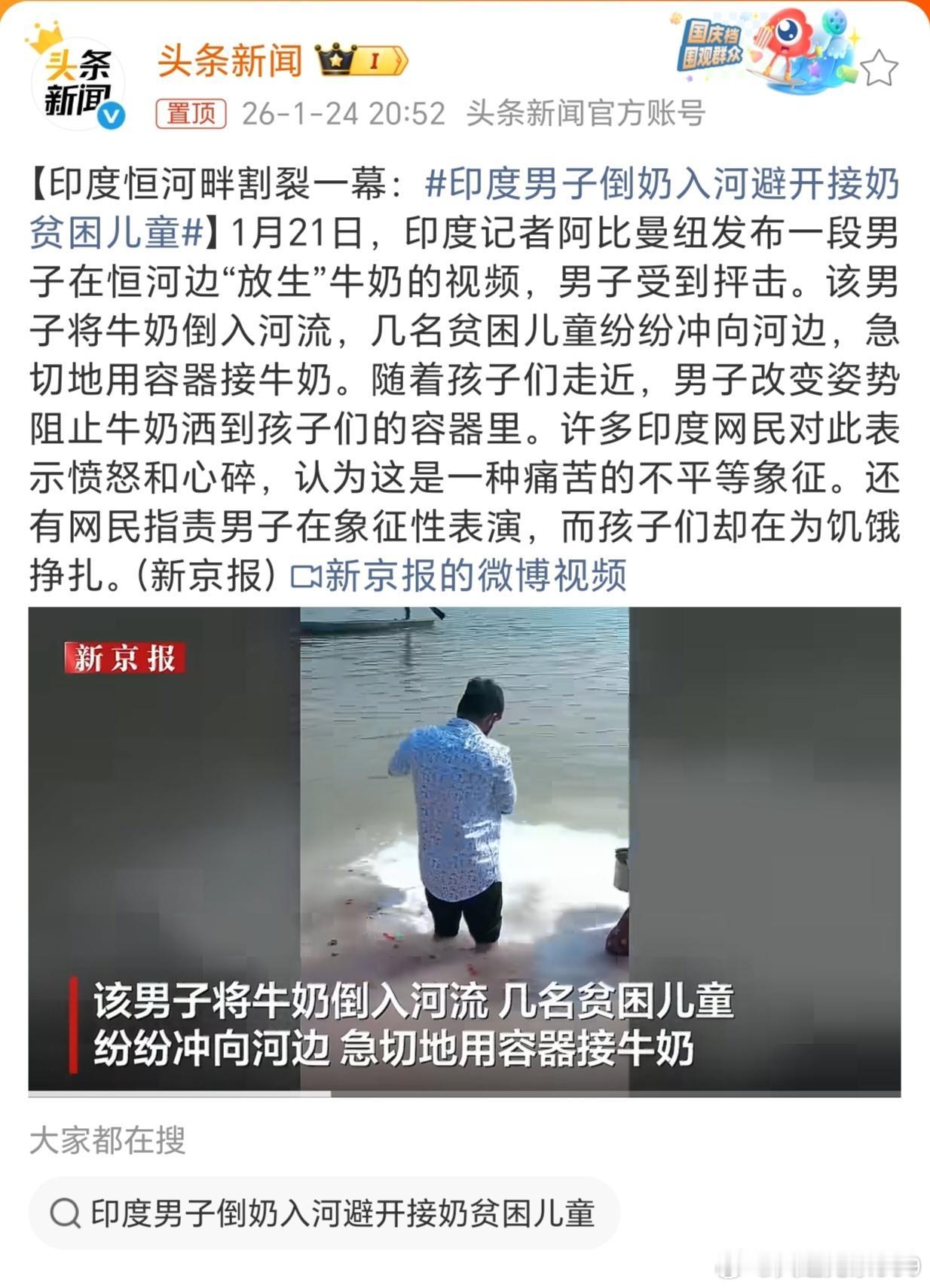 印度男子倒奶入河避开接奶贫困儿童善在济人,不在虚耗;福在积德,不在仪式。“布施”的核心本是救济匮乏,而非单纯完成仪式动作。真正的善举,从来不是为了完成仪式而消耗资源,而是让资源流向真正需要的地方,让“施”的动作匹配“受”的需求——否则,再看似虔诚的形式,也只是脱离现实的伪善,甚至是对社会资源的无端损耗。