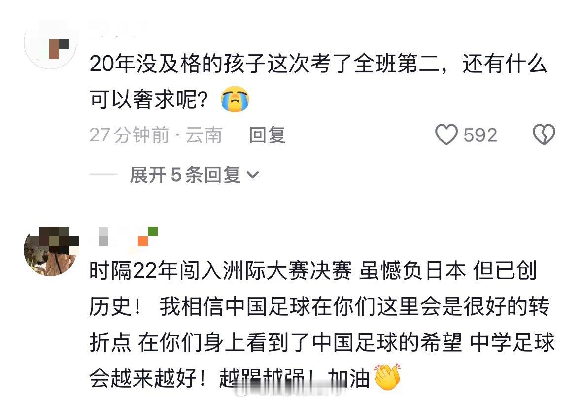 【 因为赢了很多对手所以是第二名】球迷在国足队员评论区暖心留言 2026亚足联U23男足亚洲杯决赛,U23国足0比4日本队,获得亚军。赛后,李昊、拜合拉木等发文回顾比赛,纷纷感谢广大球迷的支持和喜欢,同时表示将会继续奋斗、战斗下去。U23国足亚军 对于本次比赛获得亚军,球迷网友们纷纷暖心留言,“在你们身上看到了中国足球的希望”、“真的已经很棒了”、“不是输了得了第二名而是赢了很多对手才获得第二名”……