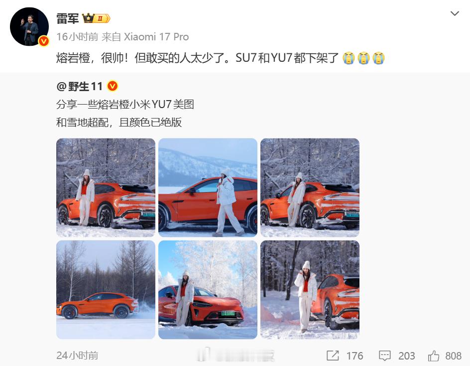 【雷军解释熔岩橙绝版原因】雷军称新一代SU7争取春节前样车进店 日前,有汽车博主分享一些熔岩橙小米YU7美图,并附文:“和雪地超配,且颜色已绝版。”随后,转发上述微博,连发三个泪目表情,解释了这款经典配色绝版的原因:“很帅!但敢买的人太少了,SU7和YU7都下架了。 ”(快科技)