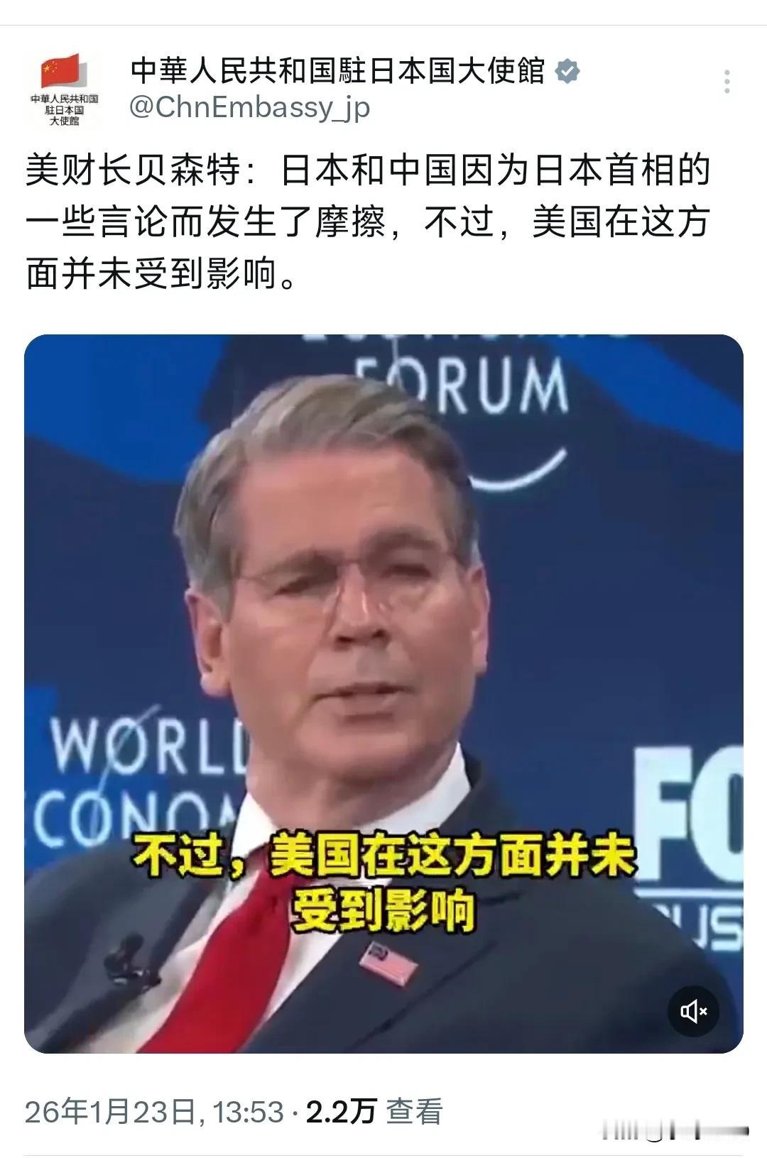 拆解驻日使馆转发贝森特视频这步暗棋 东京时间1月23日清晨,中国驻日本大使馆的