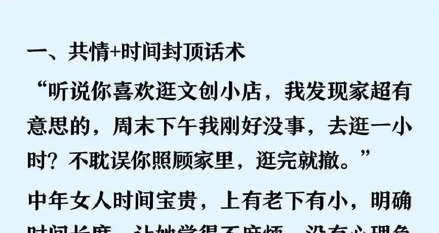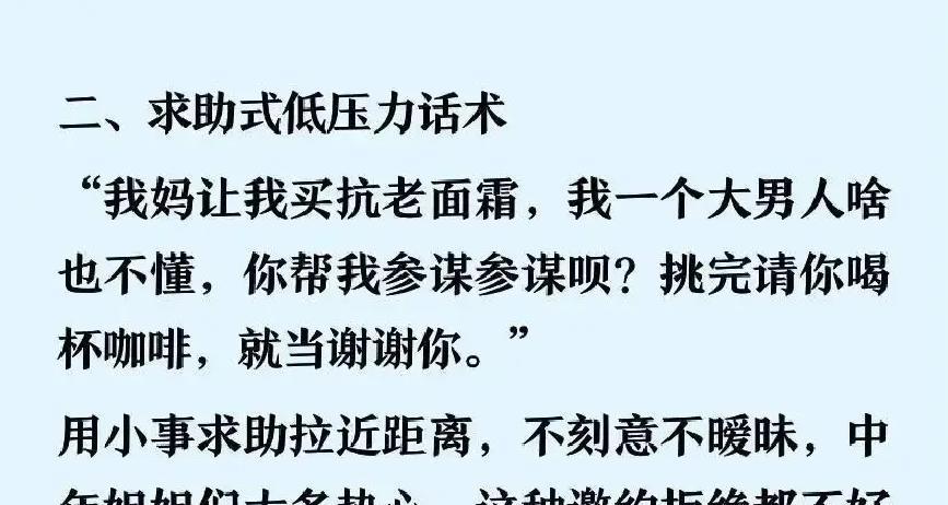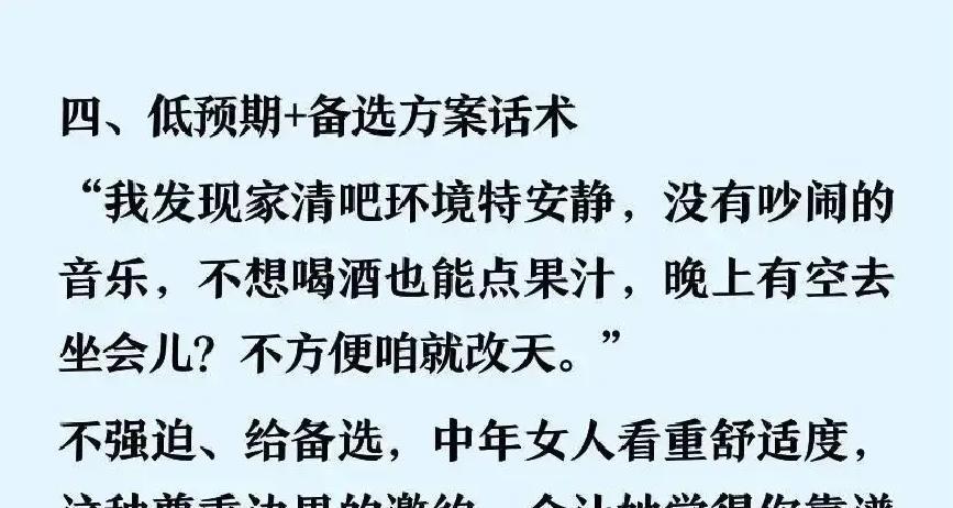 很多人遇到过这种尴尬:有些男生想约比自己年纪大的姐姐,一开口就各种花里胡哨的套路,或者紧张得像背台词,结果没聊两句对方就找借口溜了。很多人觉得是运气差,或者对方太挑剔,其实问题出在方式上。 中年女性经历过太多社交场面,对各种套近乎的把戏门儿清。她们最烦的就是一上来就用力过猛,各种暗示试探,让人觉得累。相反,如果直接点明意图,给对方足够的选择空间,反而容易让她们放松下来评估你这个人。 为什么这样?因为她们的时间和情绪都很宝贵,不想再陪人演戏、猜心思。数据显示,现代社交中,女性尤其成熟群体,更倾向于低压力、诚恳的互动方式,一旦感觉到对方在“表演”或急着证明自己,防御就立刻拉满,拒绝来得特别快。 男生常犯的错是把技巧当万能钥匙,以为背几句漂亮话就能开门。实际上,话术顶多敲开门,后续能不能继续,全看你是不是真的在听她说话、把节奏交给她,而不是一直自我输出。真诚倾听不是鸡汤,它降低了对方的参与成本,让她觉得跟你相处不费劲,这才是稀缺的。 归根结底,面对经验丰富、不缺关注的人,加码技巧只会适得其反。把压力拿掉,直接点、轻松点,才更有机会。匹配度真诚失败也干净利落;不对劲,再多套路也白搭。
