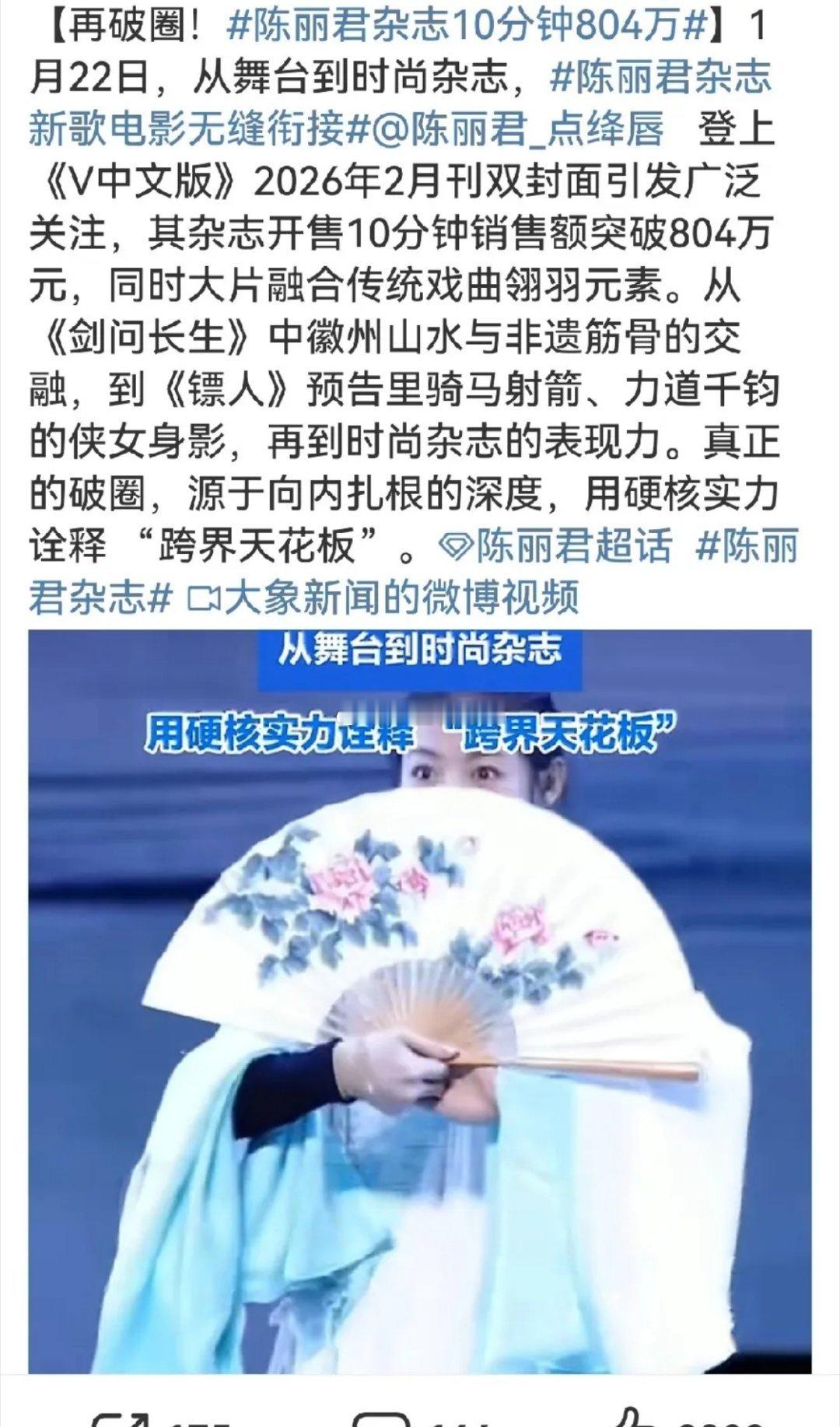 陈丽君封面杂志开售10分钟突破804万销售额,这是什么概念?这在戏曲界也是史无前例了吧,你觉得呢?