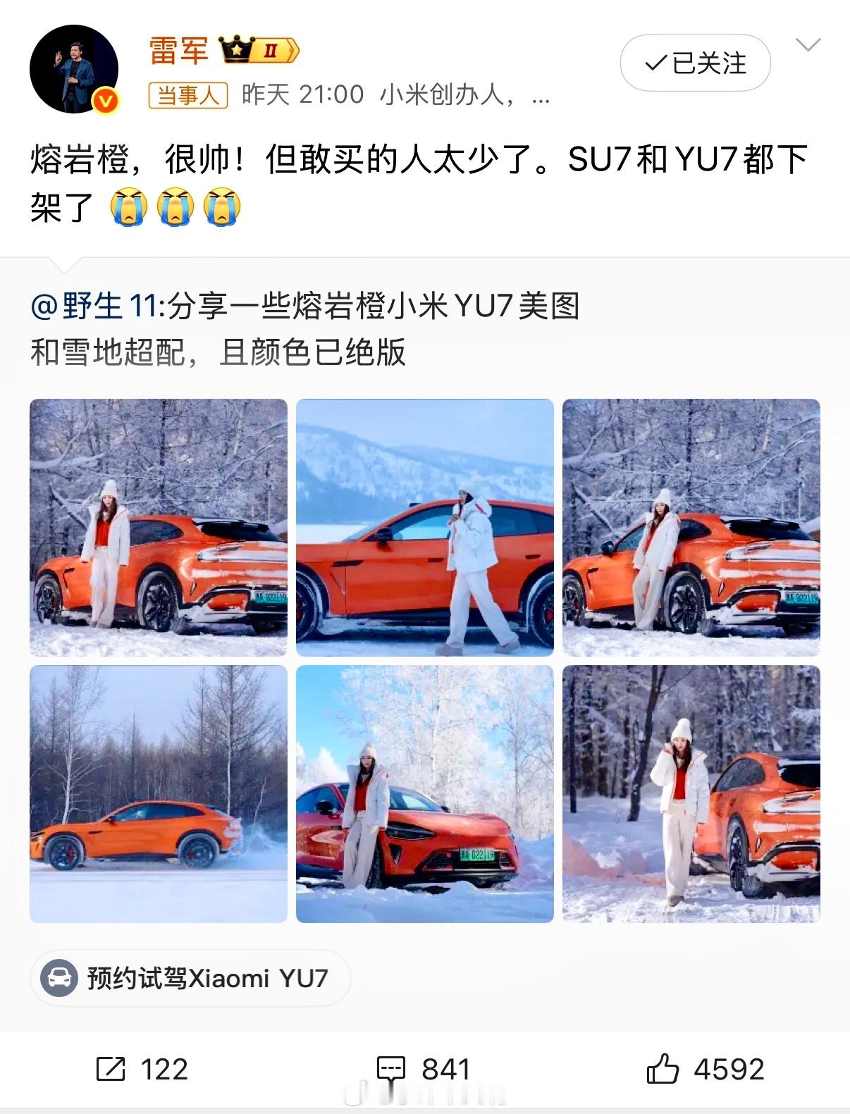 雷军在微博坦言:小米SU7和YU7的熔岩橙配色,因实际下单的人太少,不得不下架,虽然好看,但大家却不敢买。很多人嘴上夸熔岩橙“惊艳”“有豪车感”,真到掏钱时,却默默点了白色或寒武岩灰。不是不喜欢,而是顾虑太多——太高调怕成“显眼包”,补漆贵、保值低、日常打理麻烦……甚至有人笑称:“总觉得这颜色太耀眼。雷军称小米汽车熔岩橙配色敢买的人太少