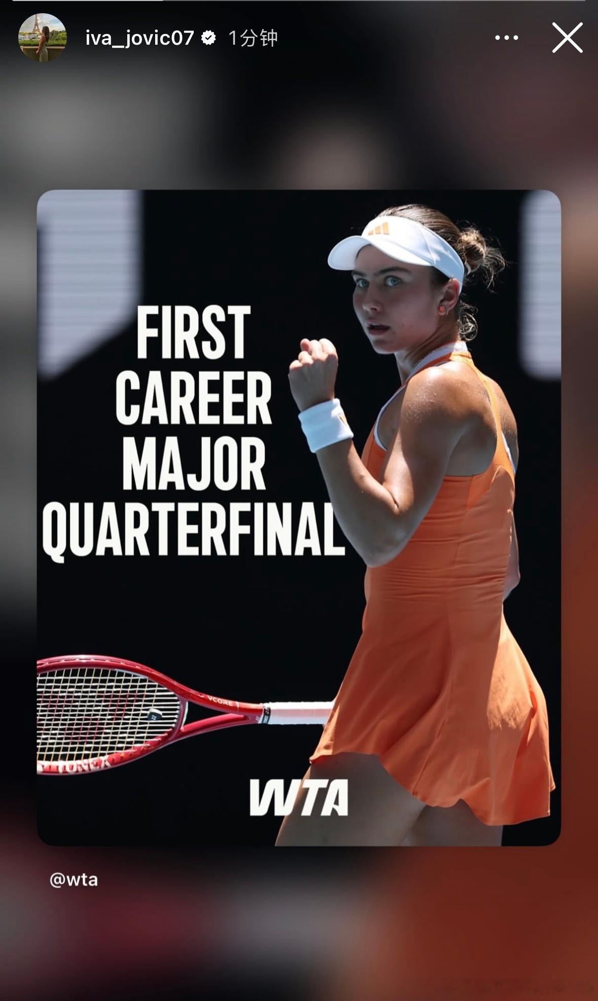 约维奇!一分钟前更新IG快拍!必须及时庆祝一下自己的第一个大满贯八强✅太火热的状态了,Iva的球真的很精彩很好看,底线进攻能力很强,而且头脑很聪明澳网2026女单1/4决赛:萨巴伦卡vs约维奇!澳网2026wta