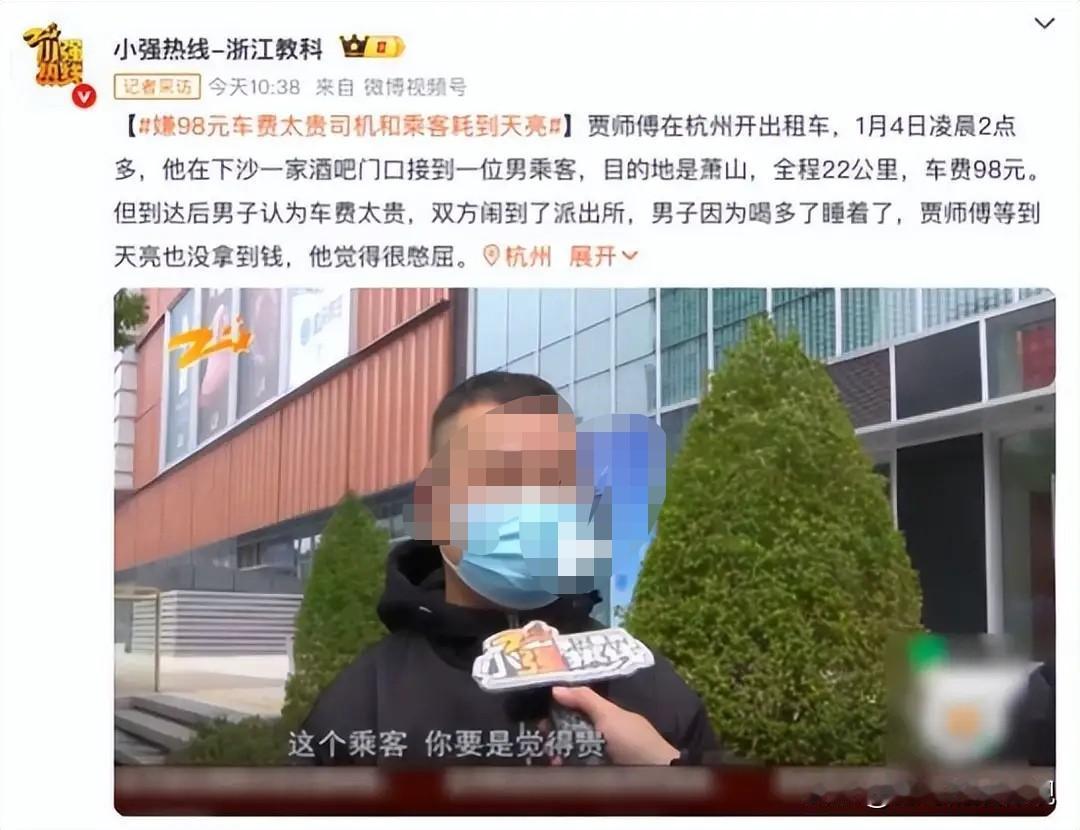 浙江杭州,深夜2点,出租车司机接到一位30多岁的男乘客,全程22公里,到目的地计价车费98元,乘客嫌贵,不如打滴滴便宜,拒绝支付车费,还直接报警。结果,一到派出所乘客睡着了,司机一直陪醒酒到天亮也没拿到车费。事后,乘客没有道歉,称自己喝多了。 贾师傅在杭州当地开出租车已经多年。 虽说各种各样的乘客都碰到过,但这次却碰到了一个奇葩的年轻乘客,给他上了一课。 1月4日凌晨2点多,贾师傅仍在辛苦的在街上拉活。 如今生意不好,但养家则无旁贷,男人吗辛苦一点没啥。 车子转到了某酒吧门口,贾师傅接到了一位招手的年轻男乘客。 男子30多岁,看上喝了酒,上车后,他说了个萧山的地址。 贾师傅也不多话,深夜车少来的也快,全程22公里,很顺利就到了。 出租车计价器显示98元车费,嘉师傅叫醒乘客,告诉他到地了,并报了车费价。 谁知乘客听说98元立马就清醒了,他说不对,这个钱付不了! 价又不是我定的!贾师傅虽然心里不痛快,但他懂得分寸,并没有和乘客争执。 他只是解释说,出租车是统一定价,自己不会多收钱。 乘客说,坐网约车才六七十块钱,那不可能差这么多吧? 贾师傅仍解释,我用的计价器经过校验的,再说,出租车本来就比网约车贵,这是事实。 再说深夜打车,价格比白天是高一点,但不会高很多。 但男乘客根本就不听贾师傅解释,一直嫌车费太多,自己付不了。 当时有乘客的朋友在场,人家一看他语无伦次的知道他喝多了,想替他把车费结了,让贾师傅先走。 男乘客却上了犟脾气,硬是拦着不让,自己又不是没钱,价格不合适当然不给钱。 贾师傅又气又急,这不耽误自己拉活吗? 但乘客拒不接受车费价格,不给车费,他又走不了。 好脾气的司机直接被气的发抖,终于和他争执起来。 乘客来了个恶人先告状,拿起手机报了警,硬说出租车司机多收了车费。 两人被带到派出所,贾师傅还没把事情讲完,乘客就打起了呼噜,睡着了。 可能是酒喝的太多,喊都喊不醒。 事情僵到这儿了,问题解决不了,贾师傅也走不开,只能陪着乘客慢慢醒酒。 可他心里跟猫抓似的,又着急,又憋屈。 一直等到早上6点,贾师傅要下班了,乘客还呼呼大睡。 他实在等不起了,再不走就交不了班,还得耽搁一天的生意。 贾师傅表示,一晚上总共挣了不到100块钱,除去抽成自己根本剩不了几个钱。 却因为碰上这么个难缠的乘客,又少跑了几个小时的车,这一折腾自己太亏了。 无奈之下贾师傅决定先离开。 他跟值班民警解释后就走了,但一直没有收到98元的车费。 事后,贾师傅气不过将事情曝光。 不成想,一石激起千层浪,有乘客有司机,人们纷纷发表自己的看法。 有人认为,出租车确实该反思了,市场更新换代很正常,出租车作为最方便的出行工具,明显跟不上时代变化了。 出租车的问题很多,比如车内环境脏、乱、差,车内气味重,司机态度不好,拒载,不等人等。 价格上,也略高于网约车、顺风车,如果不改进,怕是要被淘汰掉了。 不过,有人立马就怼了回去:无论出租车怎样,选不选择那是乘客的事。 乘客上了车,就等于同意了计费规则,坐车给钱,天经地义。 一个年轻人总不能白 嫖吧,不给钱,良心上过得去吗?脸面上过得去吗? 有问题可以投诉,拖欠车费就不道德了。 有人说,不但要让他支付车费,一晚上耽误的生意也要让那位补上。 看来人们对坐车不付费,还胡搅蛮缠的人,是看不起的。 其实每个行业、每位劳动者都需要被尊重。 换位思考,相互体谅,才是和谐的根本。 根据杭州出租车夜间收费标准,23:00-5:00, 起步价15元,3公里。 里程费3-10公里部分2.5元/公里。 10公里以上3.2元/公里,含30%夜间加成。 若存在低速等候费,每5分钟加收2.5元。 本案中,22公里正常费用约76.5元,若含少量等候费可达98元,符合计价规则。 乘客拒付车费,需承担继续支付责任。 若争执扰乱公共秩序,可能违反《治安管理处罚法》,面临警告或罚款。 网约车:动态定价+补贴,夜间可能更低。 乘客用网约车预估价,对比出租车实际费用,其实是忽略了定价机制上的差异。 2026年网约车新规,要求平台公示抽成比例,未来定价将更透明。 事后,记者联系到了那位乘客,乘客称自己当时喝多了。 开始打的是滴滴,显示车费是60多块钱,但自己当时没坐。 出租车到目的地后,司机张口就要98元,贵了将近一半,所以才发生争执。 但自己没说过不给钱,只不过双方吵了几句后报警,后面自己在派出所睡着了。 早上一觉醒了司机不见了,最终经过沟通,乘客支付了98元车费。 为区区98元车费,司机、乘客两个成年人,在派出所耗了一整夜。 那么在经济上,这算不算是一笔双输交易? 表面看是酒后冲动,实际上双方投入的时间成本,远超争议金额本身。