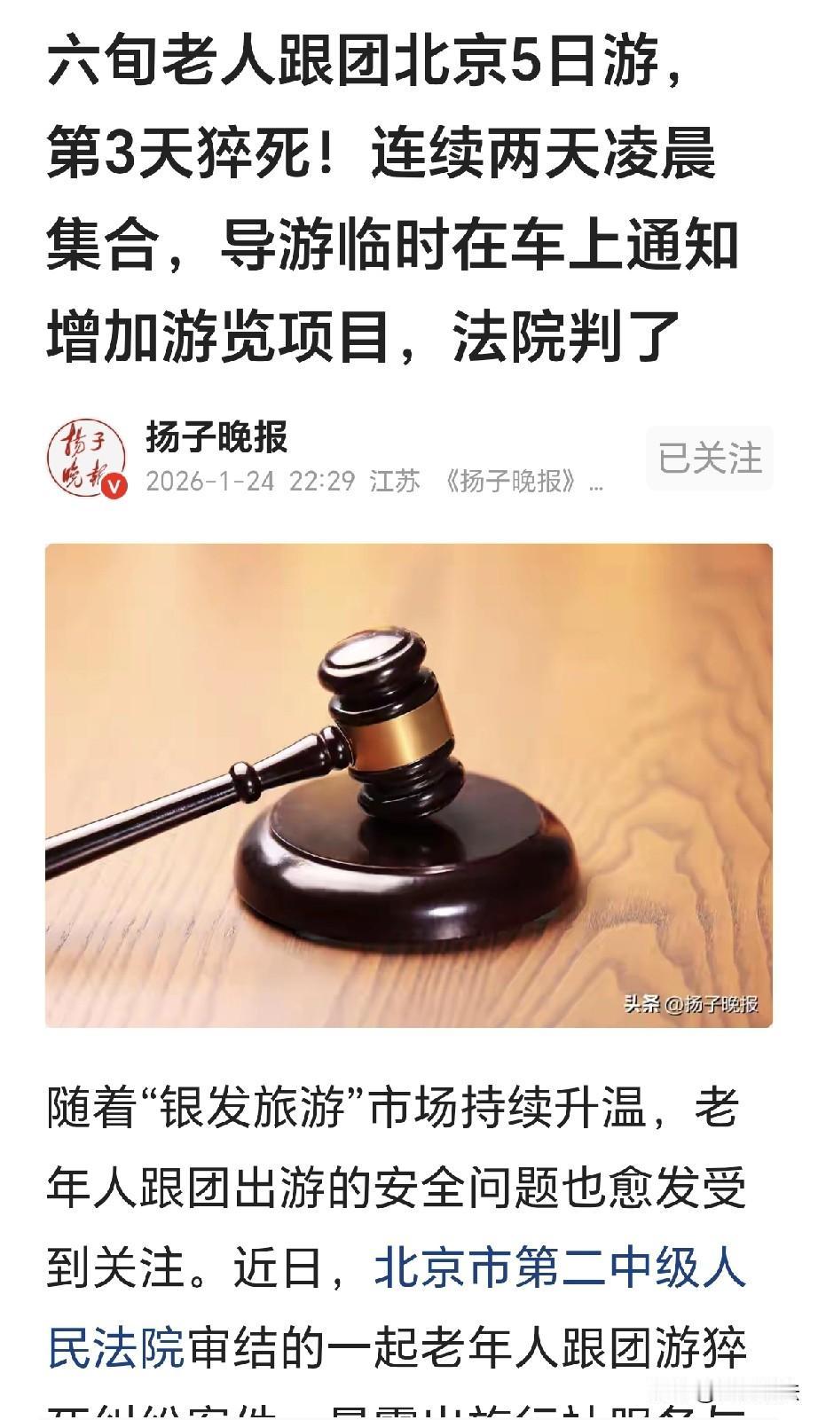这该怪谁?北京,一60岁大爷与亲友报名旅游公司的北京五日游,导游要凌晨4:15分集合,到八达岭爬长城,大爷疲惫,但来都来了,他坚持行程,原计划当天只有长城与奥林匹克公园,导游擅自增加自费项目,第三天时,旅游团凌晨3点出发,大爷抗不住了,他晕倒在地,猝然离世,家属痛不欲生,认为是旅行社高强度安排,又增加行程,在大爷晕倒时,没尽到救助义务,家属索赔。 江大爷已经60多岁,可是他腿脚利落,依旧和年轻人一样活泼。 2024 年 7 月的时候,江大爷满心欢喜,和亲友报名参加了旅游公司推出的北京五日游。 江大爷心里高兴,他这辈子忙忙碌碌,根本没有时间外出旅游,他心里暗自期盼,这趟北京之旅像是一场期待已久的梦。 他盼着能去看看雄伟的长城,再逛一逛繁华的首都,他立刻准备好了行囊,盼望着出发的那一刻赶快来到。 旅行社按照时间,准时安排大家出发,老人们心情愉悦,一路上欢声笑语,终于进了梦想中的北京。 到了第一天晚上,江大爷的手机收到了消息,导游发来短信,通知大家第二天凌晨 4 : 15 分集合,前往八达岭长城游玩。 导游只简单提了一句行程顺序调整,却没说明第二天的全程安排。 江大爷和亲友们虽然有些疑惑,但也都没太在意,反正跟着导游,导游肯定会合理的安排。 第二天凌晨,天还黑咕隆咚的,江大爷一行人就匆匆出发了到了长城,江大爷兴致勃勃,他沿着阶梯,一阶一阶的往上爬行。 可走了一会,毕竟江大爷还是年纪大了,他没过多久,明显感觉到有些疲惫。 同行的家人看着心疼,劝他要歇会再走,别太累着自己。 可江大爷高兴,能到北京,这是他早就期盼的事情,就是累点,他也愿意让自己承受。 他摆摆手表示,没事没事,我还能行,来都来了,不能半途而废,走的太慢,还会拖累了别人。 他虽然累了,依旧硬撑着继续走着,原本当天的行程计划里,只有长城和奥林匹克公园这两个景点。 可谁能想到,在去往下一个景点的车上,导游突然宣布,要增加自费演出和天坛公园游览。 这消息突然,大家有些措手不及。 江大爷和亲友虽然不乐意,但想着来都来了,来一趟太不容易。 于是他们把不满压住,当时没有多说什么。 万万没有想到,行程进入到第三天时,麻烦事儿接踵而至了。 凌晨 3 : 15 分的时候,团队又要集合前往旅游景点,这么早的时间起床,年轻人都有些吃力,更别说江大爷这样老人。 他打起了精神,勉强跟着队伍走着,可是他越走越累,渐渐落在了队伍后面。 他脚步沉重,每走一步都像是用尽了力气,他忽然眼前一黑,不受控制的晕倒在地。 同行人吓坏了,赶紧大声呼救,路人前来救助,急救人员也匆匆赶到,现场对江大爷进行了抢救。 急救人员竭尽全力,依然没能留住江大爷的生命。 抢救记录上显示,江大爷有高血压病史,医生初步诊断,江大爷的死因是呼吸心跳骤停,高血压。 江大爷走的太急,家属没有一点的准备,他们痛不欲生,亲人怎么就这样的走了? 家属认为,江大爷的去世,旅游公司有不可推卸的责任,旅行社擅自增加行程,让老人紧凑的行程变得更加高强度。 并且,旅行社的导游,在老人身体出现不适时,并没有尽到救助义务,这才导致了江大爷的死亡。 家属一纸诉状,将旅游公司告上了法院,要求他们对江大爷的死亡承担赔偿责任。 而旅游公司这边,却有着不同的说法,他们认为,江大爷的猝死,是因他的自身疾病导致。 而且他们认为,江大爷在报名时,并没有告诉他们自己有高血压病史,如果提前告知他们,他们就会做好安全注意义务。 因此旅游公司认为,他们不应该承担责任。 《旅游法》第62条规定:订立包价旅游合同时,旅行社应当向旅游者告知下列事项:(一)旅游者不适合参加旅游活动的情形;(二)旅游活动中的安全注意事项。 法院认为,旅行社存在多处违反该条款的行为:一是行程安排严重不合理,连续两日要求老年游客凌晨3-4点集合,远超老年群体的身体承受能力。 旅行社未提前告知全天行程安排,也未履行安全注意事项的告知义务。 旅行社擅自增加自费演出和天坛公园行程,未对老年游客进行特别提示变更行程的风险。 江大爷在出现疲惫状态时,导游并未及时提醒他应该休息,或者对江大爷采取关怀措施。 并且在江大爷晕倒后,导游也未及时提供应该做的救助行动。 虽然江大爷在报名时未主动告知高血压病史,其自身疾病是猝死的重要原因。 但旅行社未充分履行老年游客的安全保障与告知义务,与江大爷的死亡存在间接因果关系。 因此法院判定,旅游公司应该承担次要责任,给江大爷的家人赔偿35万元。 旅游的目的是放松身心,休闲度假,不是为了赶场打卡若干个景点。 尤其是上了年纪的老人,一定要合理安排自己的旅游行程,如果身体有病,切勿不要勉强自己。 景点能看咋看,看不到还有下次,毕竟身体健康,才是最大的人生财富。