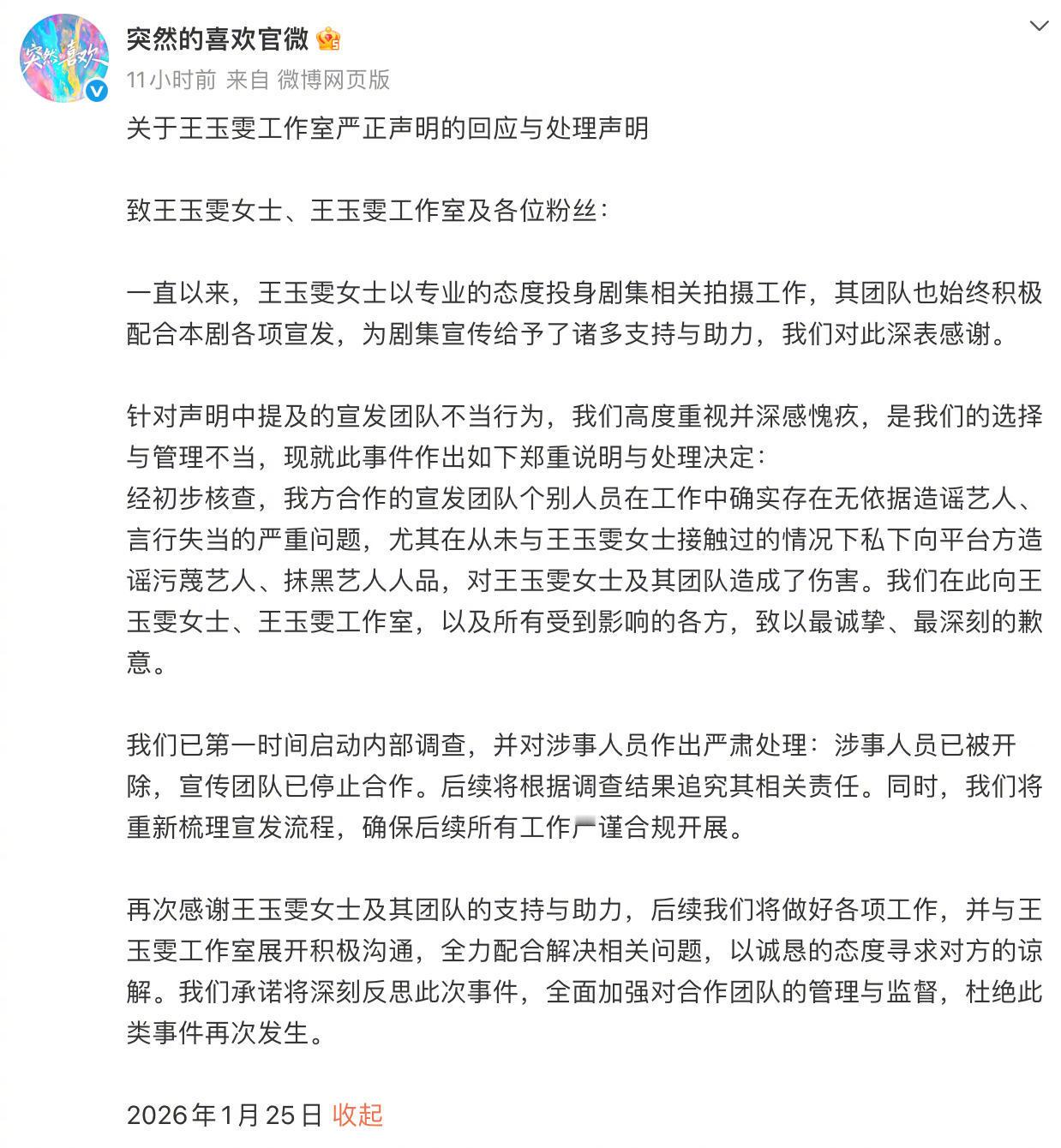王玉雯体面人都给我把王玉雯体面人打公屏上…凌晨工作室发布公告表示剧方合作的宣发团队无依据恶意造谣王玉雯,事情未解决前暂停一切宣传工作。在巴黎还倒着时差的王姐,也表示理解并支持团队维护自己名声和权益,同时也接受道歉并且会继续“手搓”剧宣。我说王姐真的太体面了,把个人委屈放一边,把剧的口碑放前面,这波回应真看得出来全是对作品的真心。不过剧方下次真得好好挑选下合作伙伴了,不能因为王姐爱搞抽象就无端造谣女演员吧😡!!王姐好,团队也好,造谣者坏!!!