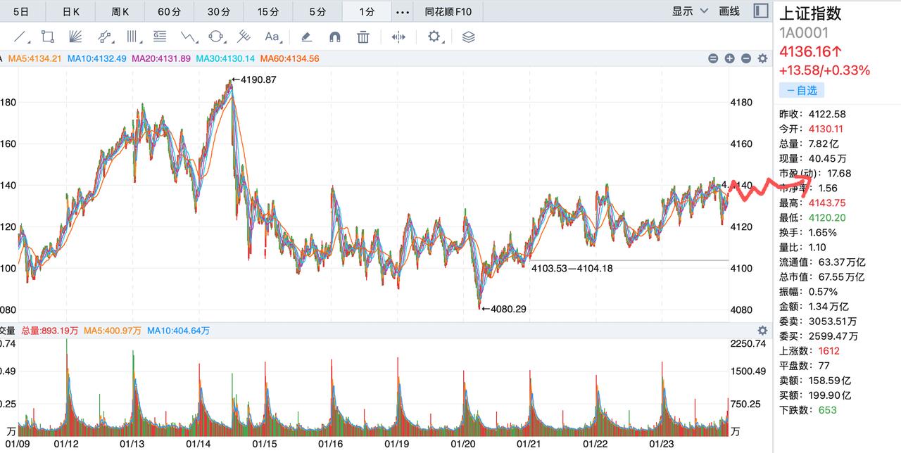 下周小心亏钱!1月份第一周确定了4000点成为历史,大盘要往4200点突破的时候,村里降温的信息出来了,这个降温让大盘从4190回调到4080点,从指数来看,这个回调大概就是2个点左右,但是从个股来看,特别是航商和ai应用的高标股,回调20个点以上比比皆是! 从4080到4130多点,花了大概1周的时间,这样的走势将成为常态,下周大盘大概率还是以震荡为主,震荡的支撑在4100点左右,跌破到4000点可能性基本没有。 下周一和周四是重要的时间窗,周一如果仅仅做日内回调,那么周四将有比较大的回调,如果周一震荡回调,可能回调的结束期在周四,支撑点大概率在4080点左右! 板块方面,太空光伏将是下周的主线,大消费和半导体可能迎来压力,另外一个板块电池板块如果走稳,大盘不会有太大的波动,反之,指数震荡会比较厉害,个股也不会太好!