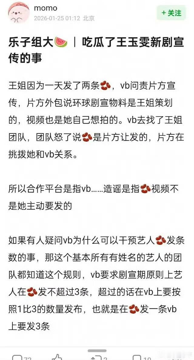啊,这啥情况啊,陈星旭的剧运好苦啊,怎么又遇到这种事情。前有众星捧自家艺人恶意切片营销,现有发小女主王玉雯被恶意挑拨与平台关系,暂停剧宣发了。