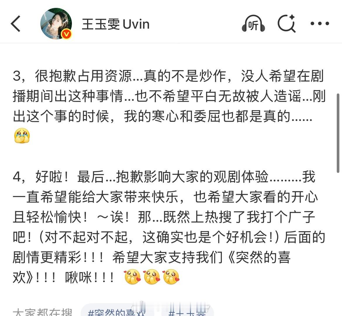 1月25日,王玉雯工作室发文,宣布全面停止《突然的喜欢》这部剧的一切宣传工作