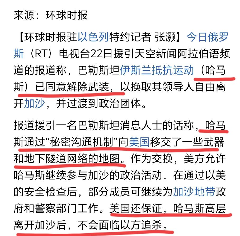 哈马斯交出武器、交出地下隧道地图,解除武装换取高层领导安全离开加沙。 哈马斯选择交出武器、奉上地下隧道地图,换取高层安全撤离加沙。这个决定从来不是妥协,而是该组织在绝境里用生存权置换存续可能的绝望博弈。当家园被战火碾成焦土,民众连温饱都成奢望,所谓的抵抗理想早已被现实碾碎。 加沙的苦难早已突破人类良知底线。联合国卫星中心的数据清晰显示,截至冲突关键节点,加沙地带超过8.8万座建筑物遭到破坏,占当地建筑总量的35%,其中3.1万多座被完全损毁。这片土地上,90%的民众被迫流离失所,只能在废墟旁搭起帐篷苟活。 饥荒正无情吞噬着这里的生命。联合国四大机构联合报告确认,加沙已有超过50万人陷入饥荒,这是中东地区首次被正式认定的饥荒灾难。3个孩子的母亲乌姆·艾哈迈德,连续数周只能给孩子吃大饼果腹。她5岁的儿子日渐消瘦,这位母亲满心绝望,生怕孩子熬不过物资短缺的日子。 饥饿带来的死亡从未停歇。加沙卫生部门统计,自新一轮冲突爆发以来,已有273人死于饥饿或营养不良,其中112名是无辜孩童。希法医院的儿科医生艾哈迈德·优素福,每天都要面对大量因严重营养不良就诊的孩子,却因药品匮乏,只能眼睁睁看着部分小生命流逝 这样的绝境里,200万加沙民众的愿望只剩下活着。两个孩子的父亲哈迪·索拉尼,每天要排队数小时争抢面粉和豆类,多数时候只能空手而归。他被迫每天只吃一顿饭,把仅有的食物都留给孩子。不少民众只能靠面包屑、草木甚至受污染的水维持生命,曾经的生活模样早已成遥不可及的奢望。 哈马斯的军事力量早已被以军系统性瓦解。以色列军队凭借精准打击和网格化清剿,硬生生摧毁了哈马斯近九成的地下隧道网络。这些曾经的战略机动通道,如今大多沦为废墟,失去了军事价值。 领导层的覆灭更让该组织指挥体系瘫痪。以军的定点清除战术成效显著,两年内击杀了11名哈马斯政治局高级干部,占该机构核心成员的70%。连最精锐的卡桑旅,也从建制部队退化成零星散落的游击力量,根本无力组织有效抵抗。 贾巴利亚难民营的场景,成了哈马斯军事存在崩塌的缩影。社交媒体流传的视频显示,多名哈马斯武装人员赤裸上身,在以军督促下缴械投降。以色列国防军总参谋长赫齐·哈莱维直言,这标志着哈马斯对加沙的统治体系彻底瓦解。 外部支援的断裂,让哈马斯彻底陷入孤立。传统支持者伊朗因自身经济困境,中止了对哈马斯的军事和财政援助。卡塔尔、土耳其等原本的斡旋方,在美国压力下转向施压哈马斯解除武装。阿拉伯主要国家也选择支持美国主导的和平方案,不再为其提供政治背书。 经济的全面崩溃,成了压垮哈马斯的最后一根稻草。加沙GDP较冲突前萎缩84%,失业率飙升至78%,当地发电站全靠联合国运送的油桶勉强运转。曾经经营贸易的优素福,战前还能在中国、埃及间穿梭经商,战争后不仅家产被炸毁,还两次被以军抓捕,最终花5000美元买路钱才逃出加沙,自嘲活得像个乞丐。 俄罗斯出资的轻武器回购计划,成了协议里最刺眼的现实注脚。一支AK47可换3000美元,而战前加沙人均GDP仅约1200美元,这笔钱相当于当地人两年半的收入。对在难民营长大的少年兵来说,放下枪不是背叛信仰,而是给全家换一袋面粉的活命钱。 哈马斯高层比谁都清楚局势。继续扛枪抵抗,只会让组织跟着民众一起饿死。他们交出武器和地图,换取高层安全撤离和组织转型的机会。部分基层武装人员可经安全检查后,编入未来的巴勒斯坦安全部队,获得合法生存出路。 这场交易的背后,是整个加沙的悲剧。以色列的封锁和打击制造了人为饥荒,联合国人权机构记录到,1857名巴勒斯坦人在寻找食物时被杀,其中上千人死在物资分发点附近。美国对以色列的偏袒,让这场灾难持续发酵,沦为对人类良知的控诉。 哈马斯的选择,是绝境里最残酷的理性。当抵抗换不来生机,当民众的苦难超出极限,放下武器成了保留组织火种的唯一方式。这场绝望交易,终究是战争对生命的碾压,是强权下弱者的无奈求生。