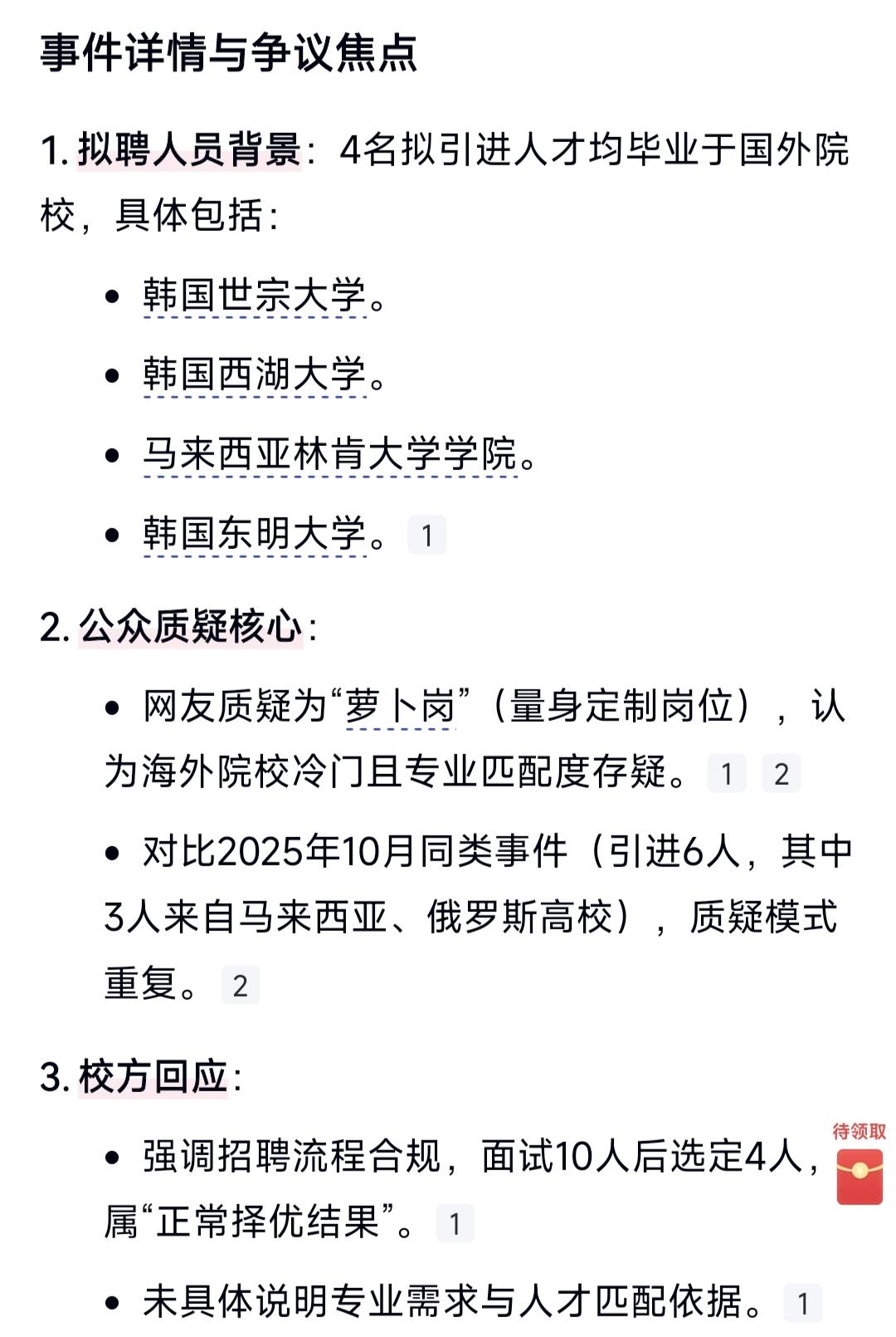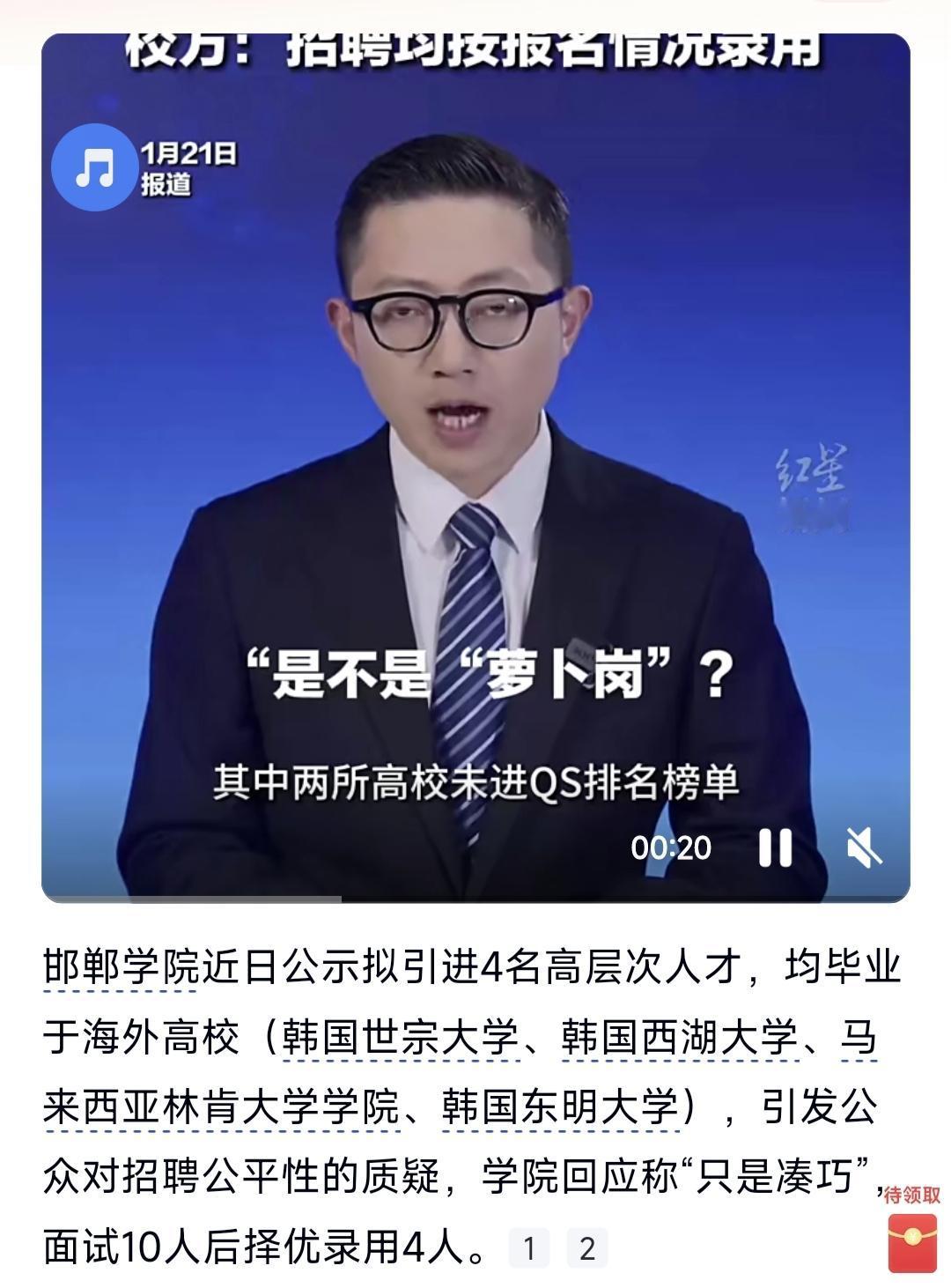 邯郸学院应当是面向全球大学选拔急需紧缺的专业人才,不然上榜的怎么都是外国的大学呢。结果韩国三所大学马来西亚一所大学的学子上榜,却被网友广泛质疑萝卜岗招聘。校方回复“因为报名人数少,所以凑巧了”,招聘环节没有问题,并不是萝卜岗招聘。其实我想有些单位挺烦招聘公示这个环节的,网友的眼睛太厉害了,网友不懂什么叫“不拘一格降人才”。教育