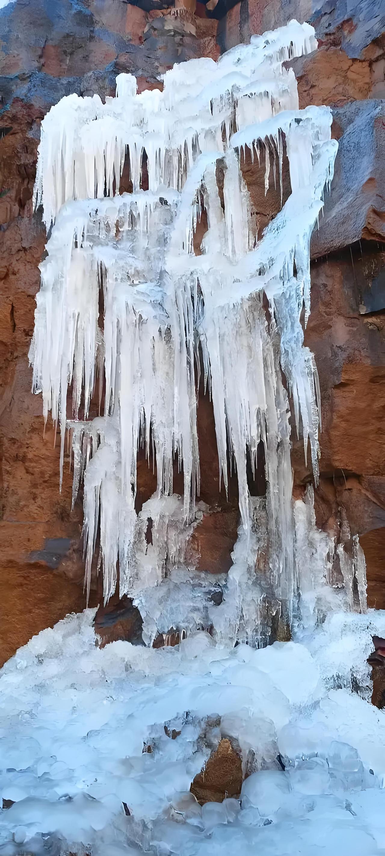 远看:飞流直下, 近视:冰布挂岩。