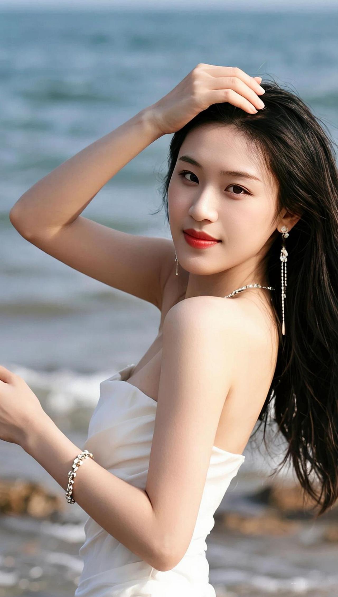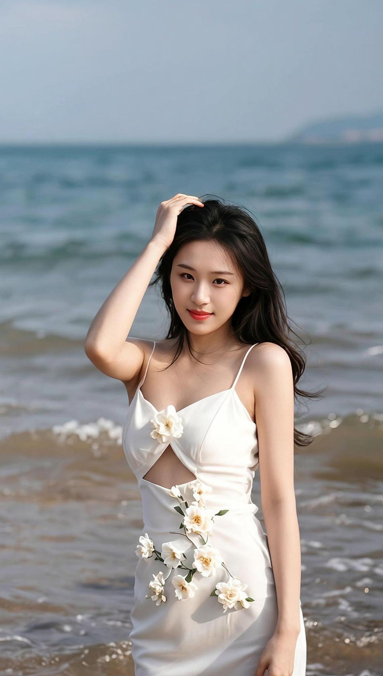 风把浪揉成细碎的银箔 你的白裙是刚落的云 发梢沾着咸湿的呼吸 指尖轻触,便漾开整片海的温柔 你不必开口 光是站在那里 就成了海岸线上 最动人的潮汐 素净人像照 素衣凝露立汀洲, 鬓畔清风惹浪柔。 笑靥轻匀霞色暖, 眸光暗涌海波悠。 一抔云影簪头落, 半阙春潮袖底收。 不借丹青描秀色, 天然风骨胜风流。