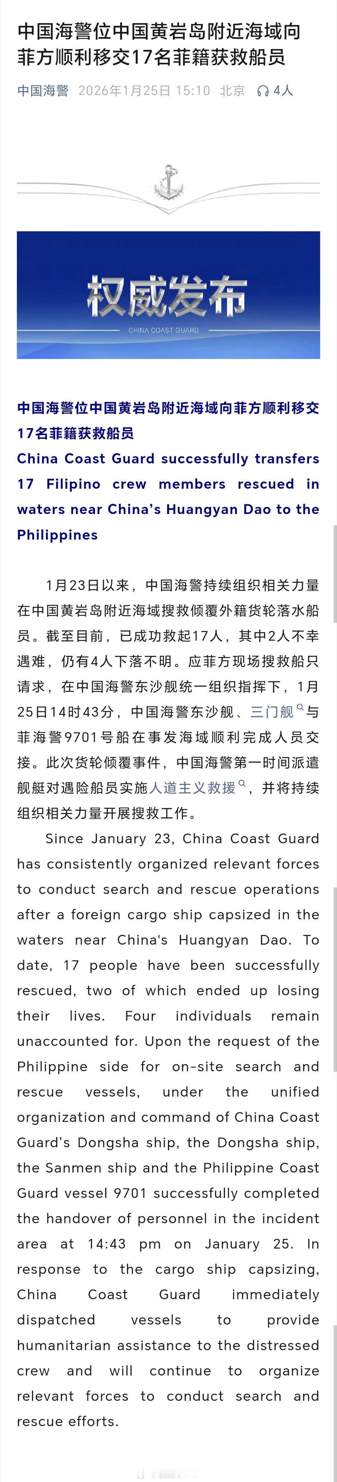 中国海警向菲移交17名菲获救船员中国海警位中国黄岩岛附近海域向菲方顺利移交17名菲籍获救船员