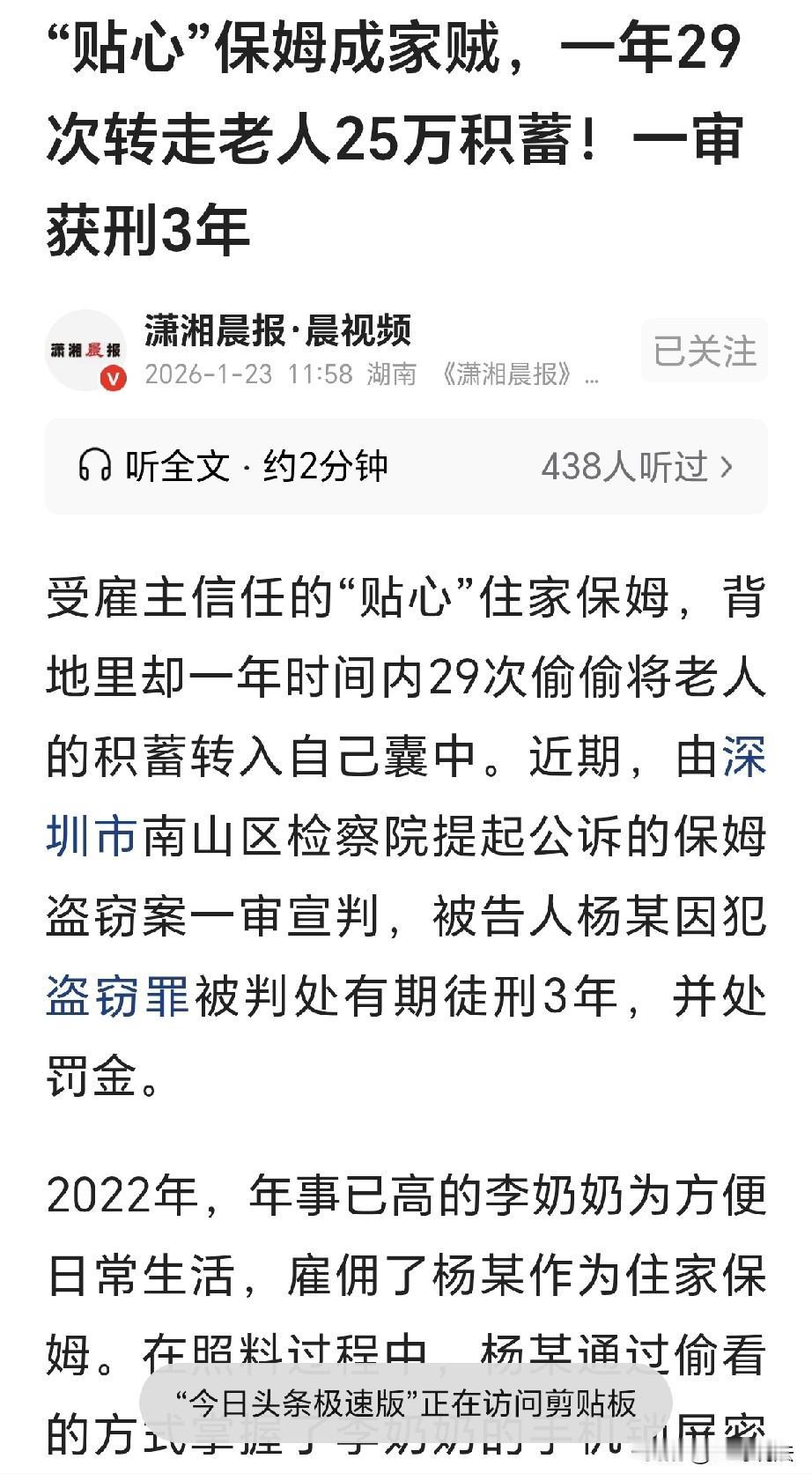 家贼难防!广东深圳,一老奶奶雇了个保姆,她表面憨厚,心里贪婪,偷看奶奶的手机密码和支付密码,利用买菜,帮看网购物品等时机,拿走奶奶手机,乘机转款29次,金额高达25万,谁知没过一年,就被奶奶子女发现,保姆被送上了法院,偷鸡不成蚀把米,这回傻眼了。 李奶奶年纪大了,可是多年以来,一直是她自己生活. 子女们都在工作忙碌,他们还有小家,对李奶奶的生活,很难做到周全的照顾。 可李奶奶逐渐老去,她老眼昏花,日常起居已经无人照料。 经过一番商议,李奶奶靠人不如靠己,年轻时她攒有丰厚的积蓄,这时候存款成了她最大的底气。 李奶奶托人,帮她找来一位住家保姆,经过一番挑选,杨某来到了李奶奶的家里。 杨某看起来老实本分,说起话来也是和和气气。 经过测试,杨某表现得手脚麻利,一会的功夫,李奶奶家里就焕然一新。 李奶奶感觉眼前一亮,阳台上的窗户都变得透明,李奶奶心里满意,当即决定将杨某留用。 刚开始时候,杨某表现得中规中矩,每天尽心尽力地照顾李奶奶的饮食起居。 她会早早地起床为李奶奶准备早餐,花样繁多,营养丰富,让老奶奶吃的十分舒心。 到了下午,闲来无事,杨某陪着李奶奶在小区里散步,李奶奶和她聊天,觉她人品实在。 到了晚上,她帮李奶奶铺好床铺,关好门窗,生活的细节,她做的全部到位。 李奶奶对杨某十分满意,觉得自己找对了人,李奶奶从此以后,对杨某再也没有任何的防备。 可李奶奶没有看到,杨某还有另一面的心思,人心隔着肚皮,杨某的内心藏着无尽的贪婪。 在照料李奶奶时,杨某有意无意地留意李奶奶的手机,有一次李奶奶用手机时,杨某假装不经意的凑了过去。 她偷偷记下了手机锁屏密码,之后,她又趁着李奶奶不注意,偷看到了V信支付密码。 这两个密码,就像两把钥匙,打开了杨某罪 恶的大门。 从 2024 年 8 月开始,杨某的贪婪已经抑制不住,每次去菜市场买菜,或者帮李奶奶查看网购物品时,她都会找机会拿到李奶奶的手机。 然后,她趁着李奶奶不注意,迅速打开微信,将账户里的钱或卡里的余额,迅速转到自己的账户。 每次转完,她都会删除转账记录,就像什么都没发生过一样,李奶奶也从没怀疑。 杨某是住家保姆,长期守在李奶奶的身旁,难免会帮李奶奶垫付一些购物的款项。 比如购买一些日用品、水果之类,李奶奶过意不去,就会定期给杨某转账结算。 李奶奶给她转账,本是正常的经济来往,可是,杨某却利用这一点,用来掩护她的盗刷罪行。 每次李奶奶给她转账,杨某都是得意洋洋,她心中窃喜,又有一笔钱进到自己的兜里。 日子一天天过去,杨某的胆子越来越大,盗刷的金额也越来越高,直到 2025 年 3 月,李奶奶的子女来看望奶奶。 家人发现,李奶奶的V信余额数额不对,并且显示,额度已经超标了。 家人奇怪,李奶奶本身花不了多少,这是如何的消费,才能导致成现在这样? 家人仔细检查了记录,这一查可不得了,里面有大量非正常的转账记录,收款人都是杨某的账户。 子女们又惊又怒,立刻问杨某怎么回事,杨某百般抵赖,但铁证如山,她不得不承认了自己的罪行。 从 2024 年 8 月到 2025 年 3 月,杨某以非法占有为目的,多次盗窃雇主钱款,累计金额高达 25 万余元。 这些钱,可都是李奶奶辛苦攒下的养老钱啊!子女们心疼母亲,更痛恨杨某的贪婪,他们毫不犹豫拨打了报警电话。 杨某被抓捕归案,被检察机关提起公诉,法院经过审理,认定杨某的行为已构成盗窃罪,且数额巨大。 法院判决,杨某盗窃罪成立,被判处有期徒刑3年,并处罚金,杨某为自己的贪婪付出了代价。 有人认为,盗25万判3年太轻了,最少该判她5年以上,可是法院依据的是法律,对她的判决没有问题。 贪心的人做什么都不长,领自己工资还嫌少,贪心不足蛇吞象,这下好了,3年才能出来。 以后在雇佣保姆时,大家一定要多留个心眼,不要仅看表面现象,保姆再好,她也只是个外人,害人之心不可有,防人之心不可无。 一定要叮咛好自己家的老人,不要随意相信他人,一定保护好自己的财产安全和个人隐私。 同时,也提醒那些心怀不轨的人,莫伸手,伸手必被捉,任何违法犯罪的行为都将受到法律的严惩。