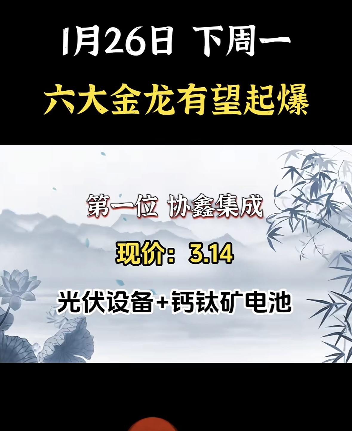 1月26日,六大金龙有望起爆!🔥🔥🔥 "光伏龙头下周或迎爆发,钙钛矿技术受瞩目,新能源赛道再升温。" "光伏龙头蓄势待发,钙钛矿技术或成新风口,静待市场验证突破时机"