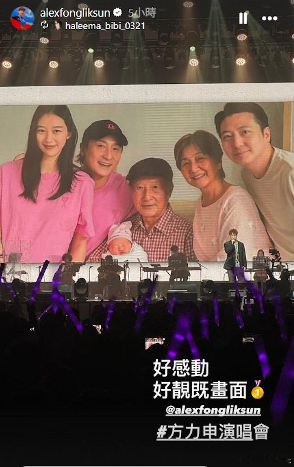 現年45歲的方力申(Alex)自去年與31歲的圈外太太葉萱(Maple)修成正果並迎來愛女Isla後,一直過著「女奴」生活,幾乎每日在社交平台分享湊女日常,並揚言要生夠四個孩子。向來對太太極度保護的小方,過往分享一家三口照時,葉萱總是「側臉」或遮樣示人。不過,昨日(24日)小方於東莞舉行《Show Up演唱會》內地巡唱最終站,竟大方豪送驚喜,首度公開三代同堂全家福,葉萱產後正面靚樣曝光,氣質超班!在演唱會的大屏幕上,方力申罕有晒出一張溫馨全家福。相中可見,小方與太太葉萱齊齊穿上 Shocking Pink 螢光粉紅色情侶裝,笑容燦爛。剛升呢做新手媽媽的葉萱狀態極佳,雖然只化淡妝,但五官清秀且氣質脫俗。而方家「第一粒孫」Isla 則由爺爺抱在懷中,閉上眼睛睡得香甜,估計是剛出世不久後拍攝,畫面溫馨感人。小方亦在 IG Story 轉發友人在演唱會拍下的照片,對方留言:「好感動,好靚嘅畫面」。