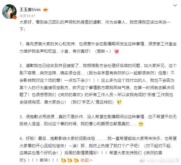 王玉雯说会继续完成宣传工作 王玉雯回应《突然的喜欢》宣发风波,诚意满满。她相信剧方,感恩工作人员,会完成宣传工作。后面剧情惊喜不断,一起追,支持这部好剧!
