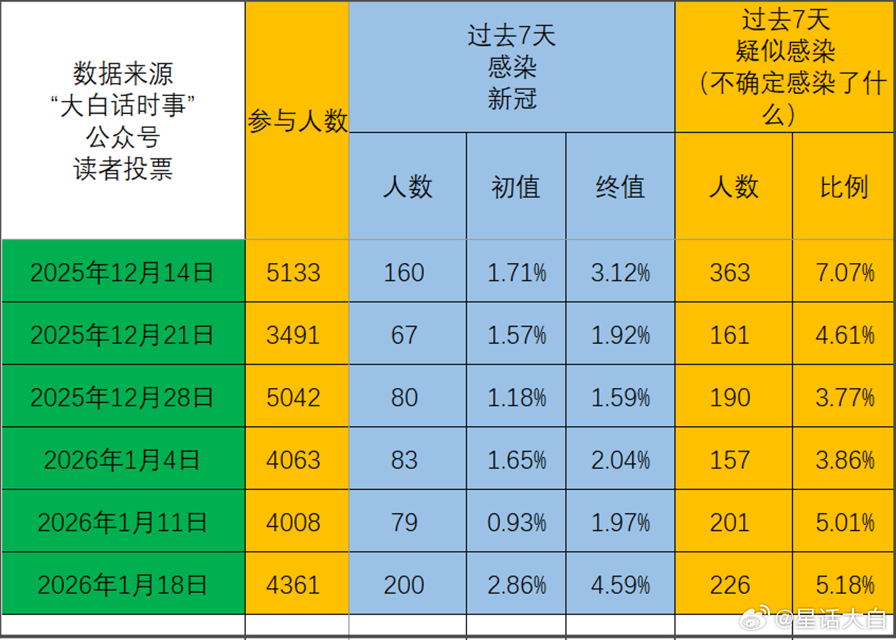 上周的新冠投票数据“7天新增感染比例”异常增高可以确定是数据污染了,看样子是有人在用一些刷数据的程序工具在恶意投票。截止1月18日的7天新增感染比例,初值为2.86%,这个初值本身相比上周就有大幅增长,但还在正常范围之内。结果1月19日看到投票人数4361人时的7天新增感染数据,终值是4.59%;这个终值数据就有些异常,过往只有在2023年5月的第二波新冠疫情里,出现这样的旱地拔葱式数据上升。不然正常情况下,是像去年5月那一波新冠疫情,先在在3月底起峰,然后缓慢爬坡一个月的时间,才在4月底进入爆发期,而不是像这样在毫无爬坡的情况下,突然爆发。正常来说,如果要出现这样的突然爆发式增长,需要有一个强力的新变异毒株。不过目前国际层面的监测数据,并没有看到这样的新变异毒株。所以,上周截止1月19日的终值数据突然达到4.59%,这本身就不太正常,当时我就有点怀疑是不是出现数据污染。结果,决定性证据出来了。又过了一天,1月20日投票截止时的投票人数4656人时,7天新增感染数据是6.6%;这就很明显是有人在恶意投票,1天时间里新增的300人投票里,有100人投了7天内阳过,阳性率达到33%;这显然不符合正常投票在任意时间段,投票数据都应该是均匀的,波动相差不会太大的规律。而且从这个恶意投票规律来看,还是采用了程序化投票,也就是并不是说把投票丢到某一个“恶意投票群”里,然后一堆人集中投票,导致数据异常。而是采用程序化工具,均匀的持续投票。然后因为我投票是在周六和周日文章里贴出来,80%的投票人数会在周六、周日、周一这三天里投票,所以在头3天里还看不出明显的数据污染。但在周二,因为参与投票的人数没有多少了,这时候还持续均匀程序化投票的数据,就会显得异常凸出。显然是有人想通过这样的恶意投票,来进行数据污染,把我们的投票搞废。而且是恶意投“7天内阳过”,就是想让我发出错误预警,增加大家焦虑,降低投票可靠性。不过好在我第一时间就察觉到数据异常的问题,所以我在周一,额外发了一期投票,目前看,周一额外的投票,没有受到数据污染,目前统计出的7天新增阳性率是2.46%,这个就在正常范围之内,没有出现大幅偏离。从修正后的这个数据看,目前仍然还是在新冠低谷期的范畴。再看其他各方数据。香港第2周的新冠疫情数据显示,7天新增阳性数是6例,仍然还在绝对低谷期里。中疾控第2周的数据显示,流感阳性率继续大幅下降,估计再有个两周就能完全过峰进入低谷期了。呼吸道合胞病毒RSV继续上升,新冠病毒阳性率则环比下降0.15;中疾控的新冠阳性率仍然还是维持在1.1%的低位。结合其他各方数据,目前仍然没有看到新冠疫情起峰的迹象。#新冠感染情况#