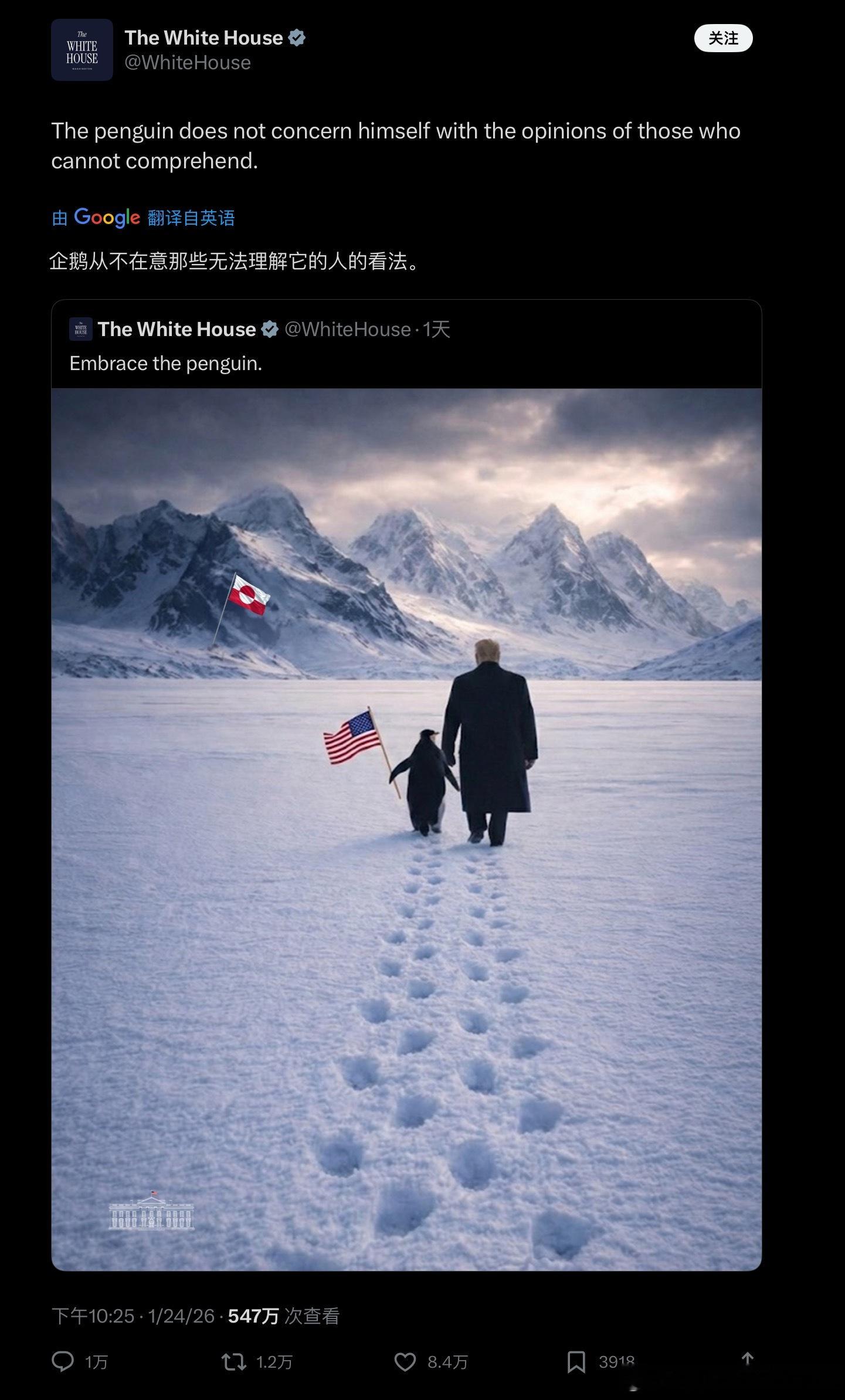 特朗普因格陵兰岛向欧洲8国加税因将南极企鹅误认为格陵兰岛生物、并以此制作低智AI宣传海报而遭全球网民群嘲的白宫,再次狡辩挽尊又被群嘲了白宫be like:“企鹅不会在意那些听不懂话的人的看法”(我说格陵兰有企鹅就是有企鹅!)加深美国红脖不爱读书还死好面子的刻板印象,笑yue了