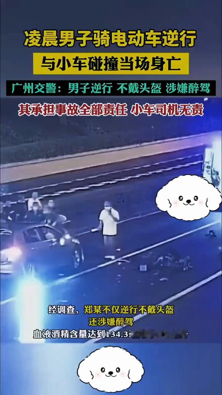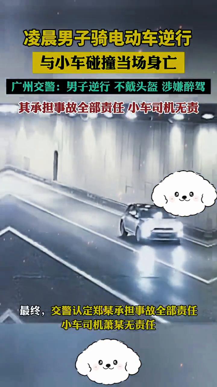 凌晨男子骑电动车逆行,与小车碰撞当场身亡。广州交警:男子逆行不戴头盔涉嫌醉驾,其承担事故全部责任,小车司机无责。 经调查,郑某不仅逆行不戴头盔,还涉嫌醉驾,血液酒精含量达到134.3毫克每100毫升。 近日,广州交警公布一起典型事故,凌晨四点男子(郑某)驾驶电动自行车在隧道口和小车狠狠撞上,郑某当场死亡。最终,交警认定郑某承担事故全部责任,小车司机萧某无责任。 交警提醒:每个人都是自身安全的第一责任人,郑某对法律与规则的漠视,最终赔上了自己的生命,大家引以为戒。