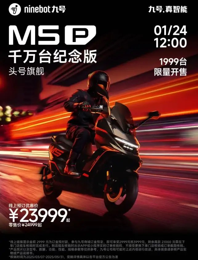 【九号电动 M5 P千万台纪念版车型发布,首发23999元起】九号智能两轮电动车迎来重要发展里程碑 —— 国内累计出货量正式突破一千万台。九号同步推出 M5 P 千万台纪念版车型,限量: 1999 台发售,首发优惠价: 23999 元起。据介绍,该车型基于 M5 P 的性能与智能平台打造,并融入千万台专属设计元素与定制标识,具备独特的纪念意义与收藏价值。M5 P 千万台纪念版作为一辆智能电动摩托车,搭载了零极 X1000 控制器专属配置,电机额定功率 10kW、峰值功率 16kW,最高时速可达 120km/h;配合新能安 72V90Ah 大单体电池,工况续航达 185km。车辆采用达喀尔车队专业调校的 AXC-S 高刚性车架,兼顾高速稳定性与操控安全。同时,满配 RideyFUN 智驾系统、双向油门、双路行车记录仪。九号 M5 P 千万台纪念版定于 1 月 24 日 12:00 在九号官方商城小程序、九号出行 App 商城同步开售。